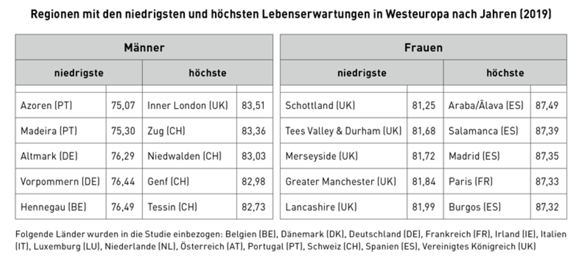 Gleich zwei Regionen in Deutschland sind laut der Studie bei der Lebenserwartung Schlusslichter in Westeuropa: So hatten Männer in der Altmark in Sachsen-Anhalt mit 76,29 Jahren die drittniedrigste und Männer in Vorpommern mit 76,44 Jahren die viertniedrigste Lebenserwartung von allen 450 untersuchten westeuropäischen Regionen. Schlechter schnitten nur noch die über 1.000 Kilometer vom Festland entfernten portugiesischen Inseln Madeira und die Azoren ab.