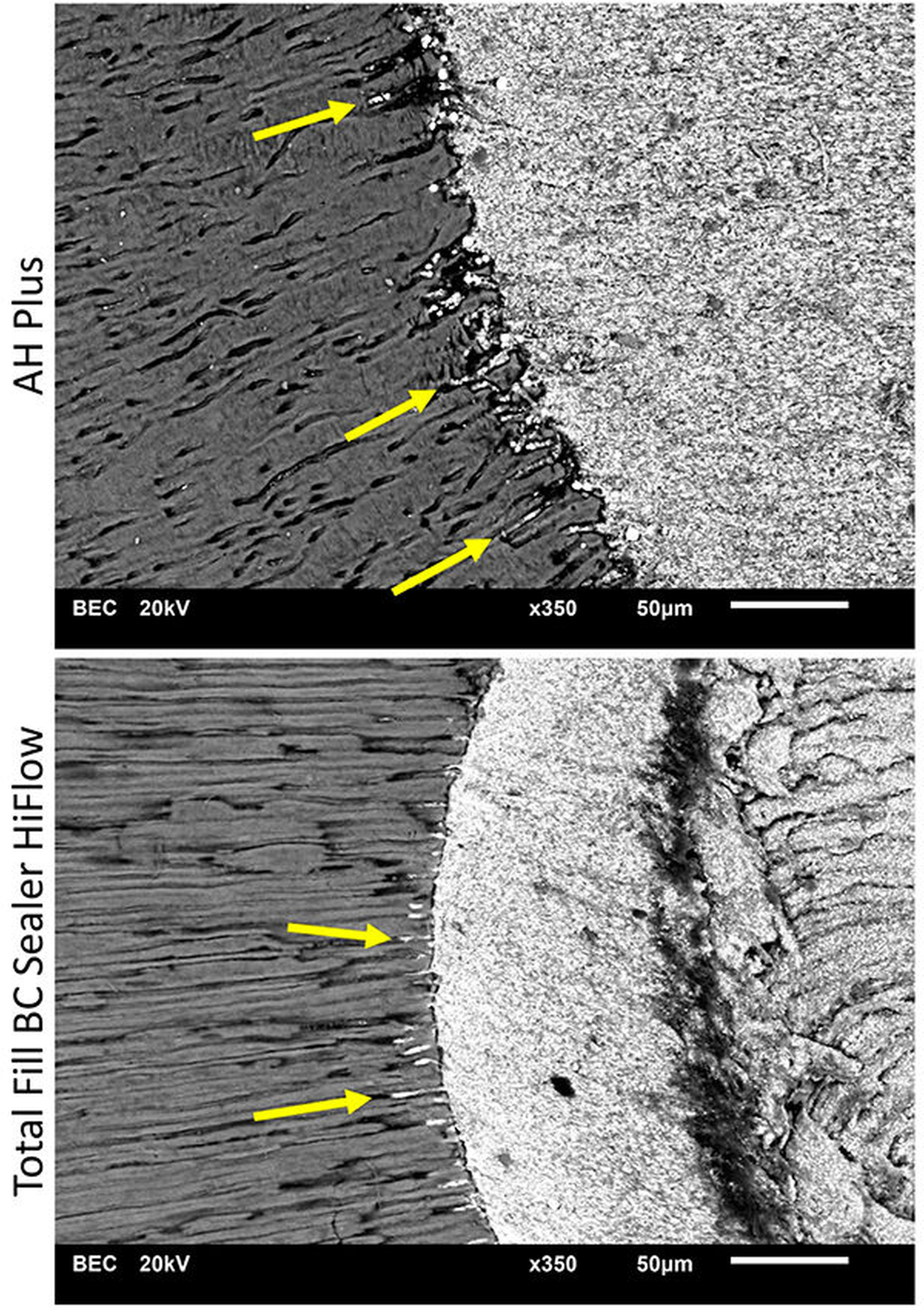 Die Partikelgröße des Sealers scheint jedoch keinen signifikanten Einfluss auf die Eindringtiefe zu haben. Dass kleinere Partikel bei gleichem Druck tiefer in die Tubuli gedrückt werden, ist theoretisch wahrscheinlicher. Ein solches Phänomen wurde jedoch nicht beobachtet. Für AH Plus wird eine Partikelgröße von bis zu 8 µm angegeben. Für TFHF existieren der Studie zufolge keine Angaben, jedoch wird für das Vorgängerprodukt Total Fill BC Sealer (FKG Dentaire, St. Maur de Fossés, Schweiz) eine Partikelgröße von weniger als 0,2 µm angegeben.