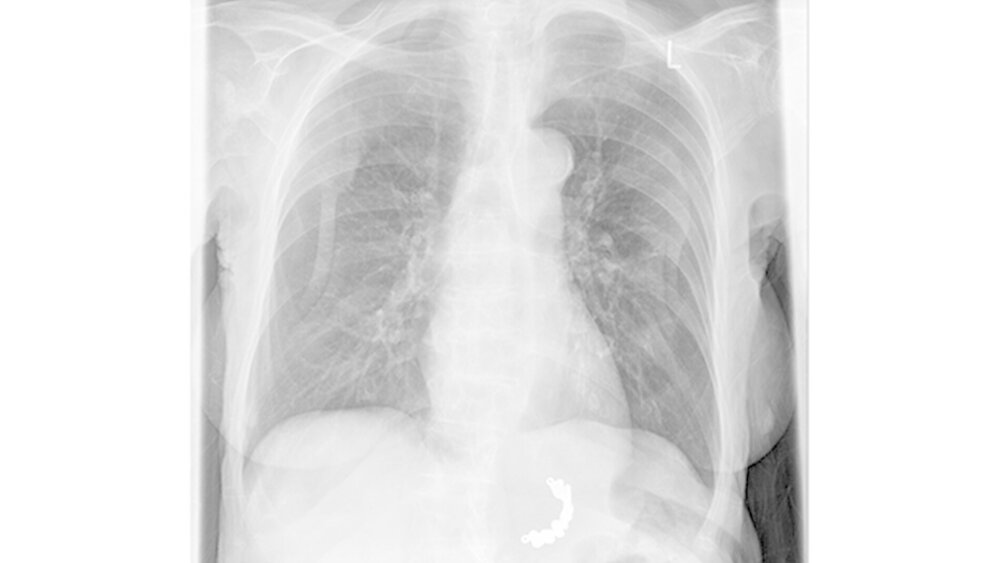 Neben einer Kachexie lag bei der Patientin seit Langem eine ausgeprägte Dysphagie (Schluckstörung) vor, so dass die Nahrungsaufnahme nur assistiert und in flüssiger Form möglich war. Die Patientin war mit einem Kronenblock (34 nach 45) versorgt, der aufgrund von Zahnfrakturen eine nur noch sehr schwache Retention auf den verbliebenen Pfeilerzähnen haben konnte. Dieser Kronenblock löste sich offensichtlich von den Pfeilerzähnen und wurde von der Patientin verschluckt.