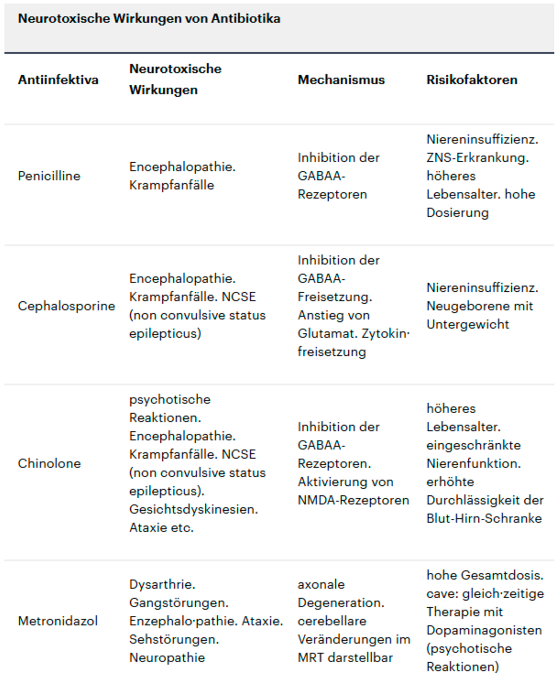 Schwerwiegendere Wirkungen am ZNS sind zum Beispiel Krampfanfälle oder psychotische Reaktionen. Oftmals wird erst beim Absetzen des Antibiotikums und bei einem zeitnahen Rückgang der Symptome ein Kausalzusammenhang mit der Medikation deutlich. Für die Praxis ist es daher essenziell, einige Risikofaktoren zu kennen, die zu einer arzneimittelinduzierten ZNS-Reaktion beitragen können. Durch die Berücksichtigung solcher Faktoren kann die Therapie mit Antibiotika sicherer gemacht werden [Grill und Maganti, 2011].