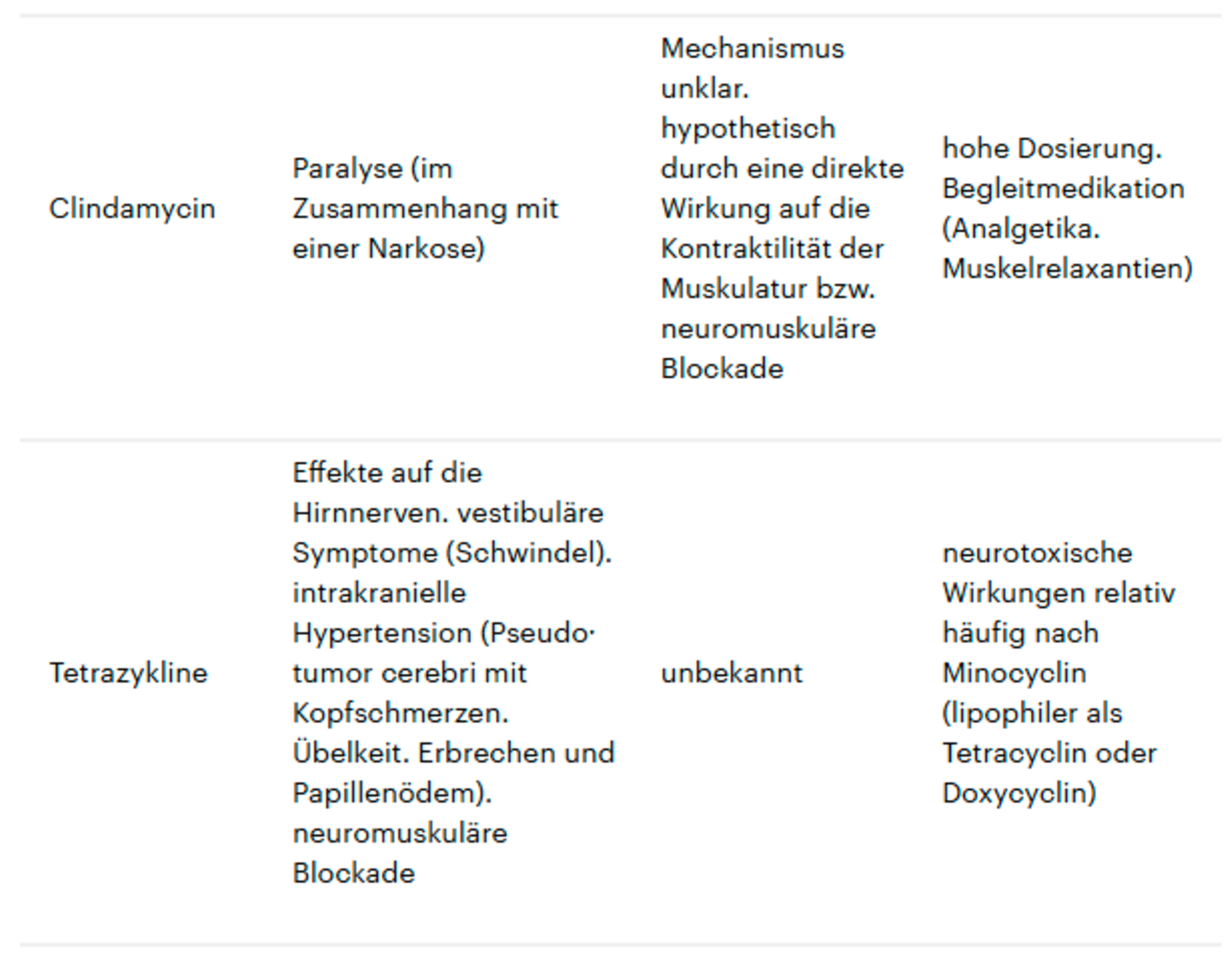 Die häufigsten Nebenwirkungen, die durch Clindamycin verursacht werden, betreffen den Gastrointestinaltrakt oder die Haut. Neurotoxische Wirkungen sind eher ungewöhnlich. Neuromuskuläre Blockaden sind allerdings beschrieben worden, die vor allem im Zusammenhang mit parenteraler Gabe im Rahmen einer Narkose aufgetreten sind. So führten Ärzte in Shanghai, China, den Atemstillstand einer Patientin auf eine Kombinationswirkung von Clindamycin mit Fentanyl zurück. Allerdings hatte die nur 37 kg wiegende Patientin mit 1,2 g Clindamycin eine sehr hohe Dosis erhalten [Wu et al., 2015].
