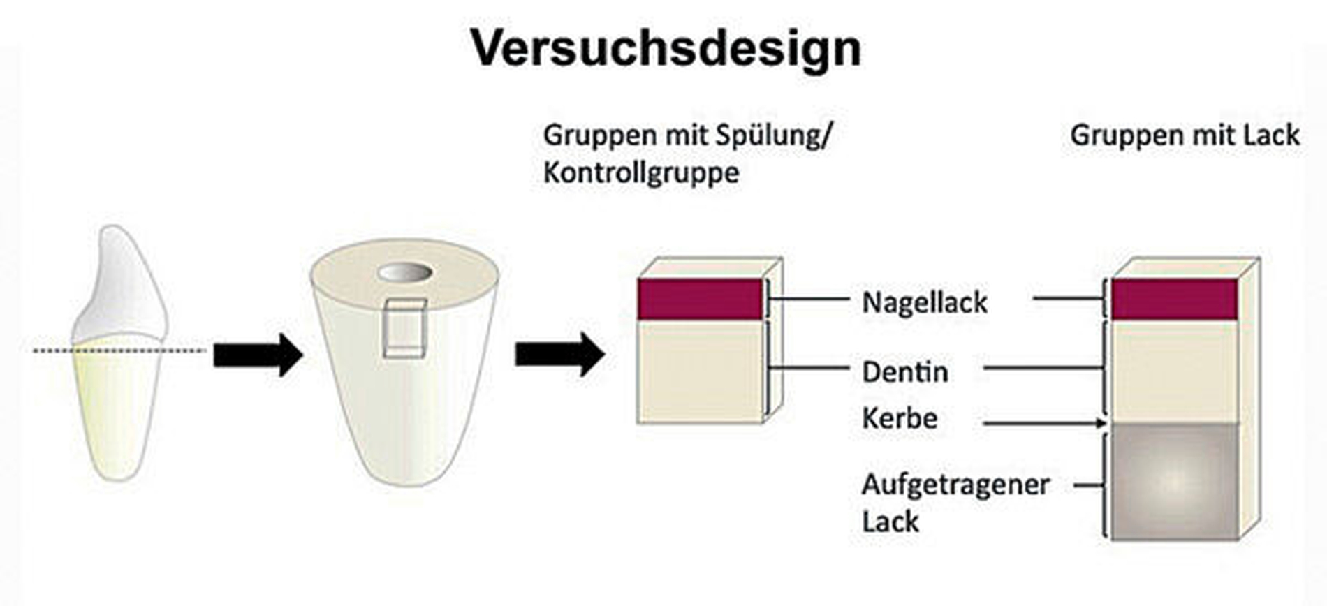 Aus den Wurzeln von Rinderzähnen wurden 140 Dentinproben gewonnen (Abbildung 3) und randomisiert einer von sieben Gruppen mit je 20 Proben zugeteilt. In vier Gruppen wurden jeweils Lacke appliziert: 38-prozentiges Silberdiaminfluorid, 35-prozentiger Chlorhexidinlack, 22,600 ppm Natriumfluoridlack, Plazebolack (Lack ohne kariesprotektive Substanz). In zwei Gruppen wurden Spüllösungen appliziert: 500 ppm Natriumfluoridspülung und 0,1-prozentige Chlorhexidinspülung. Eine Gruppe wurde nicht kariespräventiv behandelt und diente als Kontrolle.