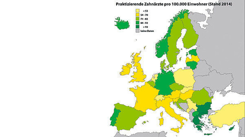 • 2014 waren in der EU 343.329 Zahnärzte approbiert (ohne Bulgarien, Tschechische Republik, Dänemark, Frankreich, Kroatien, Zypern, Österreich, Slowenien, Slowakei, Vereinigtes Königreich, Schweiz, Montenegro, Mazedonien, Albanien, Türkei).