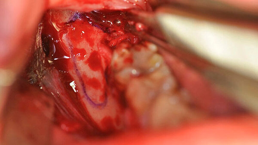Der aufsteigende Unterkieferast kontralateral wurde durch eine identische Schnittführung dargestellt, die zu erwartende Ausdehnung der Zyste eingezeichnet (Abbildung 3). Mittels Piezosurgery wurde ein crestales Knochenfenster gebildet. Die vollständig intakte Zyste und auch der Zahn 48 konnten anschließend problemlos unter Schonung des Nervens entfernt werden (Abbildung 4). Der ausgeprägte Knochendefekt wurde mittels autogener Beckenkammspongiosa versorgt (Abbildung 5) und durch das crestale Knochenfenster verschlossen (Abbildung 6). Weiterhin wurden die Zähne 18 und 28 extrahiert.