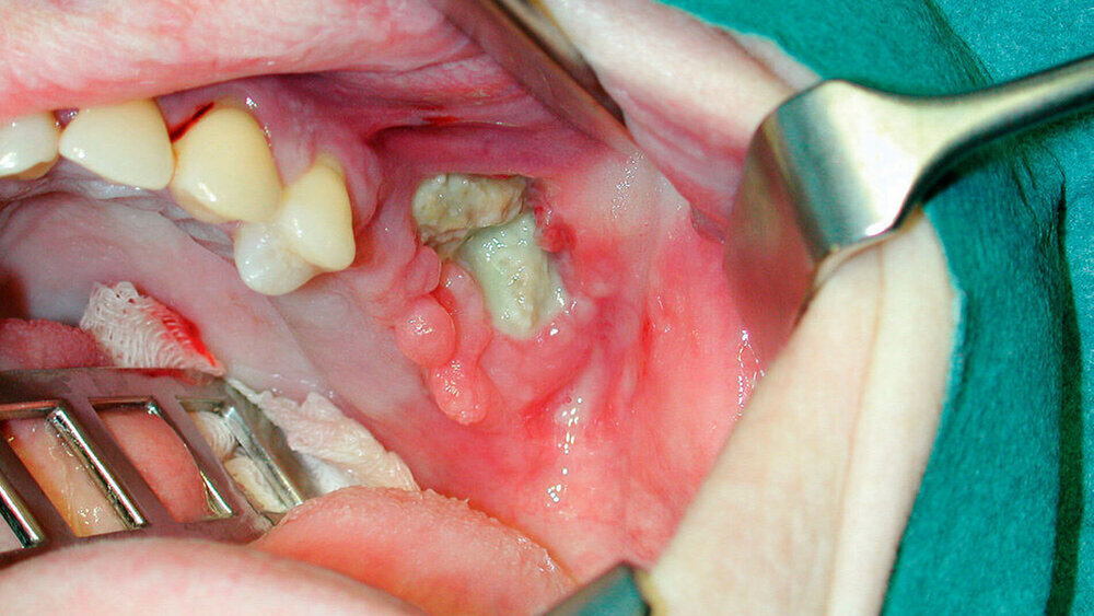 Es erfolgte eine Zahnextraktion, obwohl die Patientin über einen Zeitraum von 15 Monaten aufgrund ihrer Osteoporose Bisphosphonate (jede Woche 70 mg) genommen hatte. Vor der Extraktion wurde nicht nach der Einnahme von Bisphosphonaten gefragt.