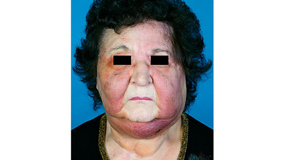 Eine 75-jährige Patientin, in gutem Allgemeinzustand und ohne relevante Nebendiagnosen, stellte sich mit einem ausgeprägten, schmerzhaften, rezidivierenden und bislang therapieresistenten, rötlichen Gesichtsödem der Gesichtshaut vor (Abbildung 1). Das Gesichtsödem trat erstmals nach einer Alveolarkammaugmentation mit bovinem Knochenersatzmaterial und der späteren Insertion von Zahnimplantaten im Ober- und im Unterkiefer acht Monate zuvor auf.