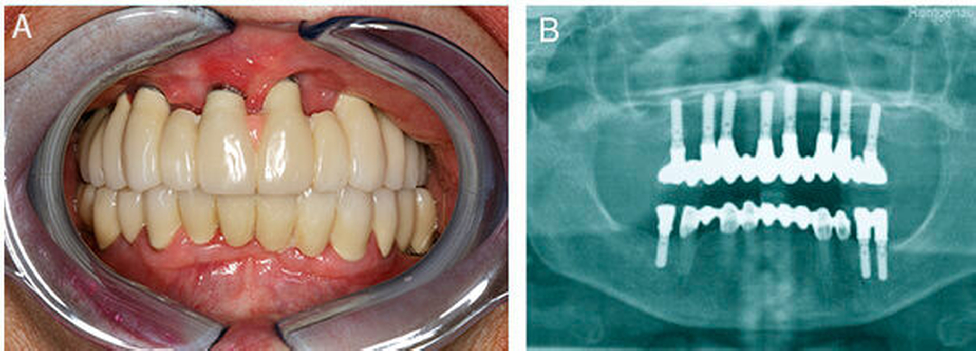 Zwischenzeitlich wurde die Symptomatik mit Hinblick auf eine allergische Genese mehrmals alio loco frustran mit Antihistaminika und Kortison therapiert. Zum klinischen Untersuchungszeitpunkt forcierte die Patientin die Entfernung der Implantate und des Knochenaugmentats. Die aktuelle Panoramaschichtaufnahme der Patientin zeigte reizfreie und gut osseointegrierte, prothetisch suffizient versorgte Implantate (Abbildung 2).