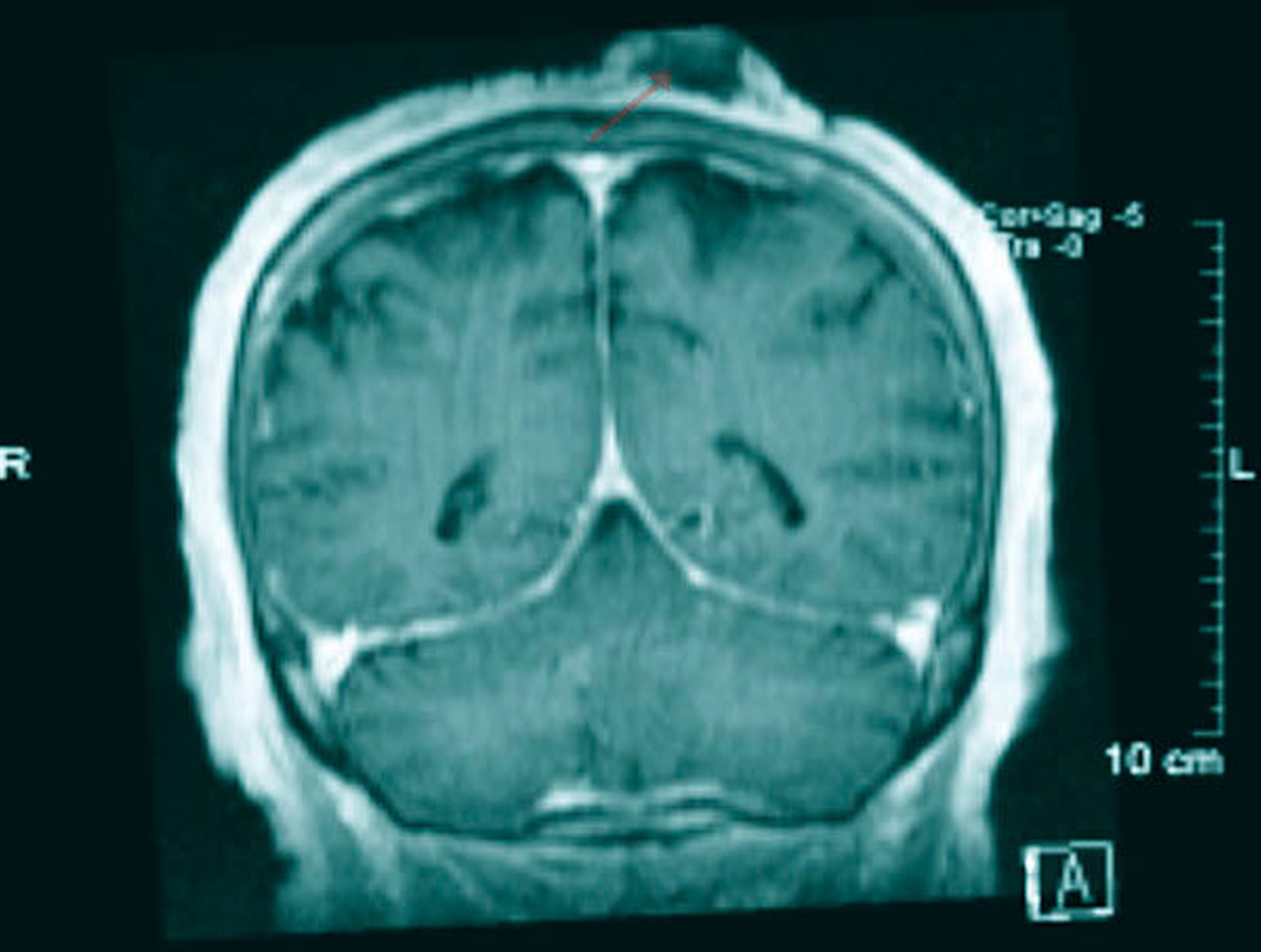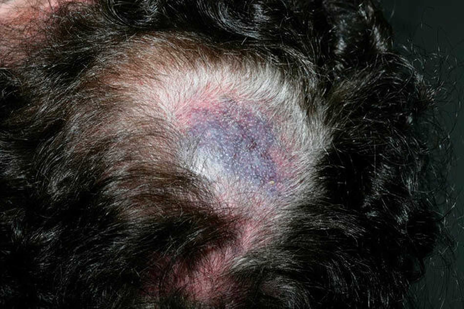 Zusätzlich zeigte sich bei der klinischen Untersuchung ein faustgroßer, violett schimmernder, erhabener und derber Tumor der behaarten Kopfhaut (Abbildung 3). Parallel zur erneuten Allergietestung zum sicheren Ausschluss einer allergischen Reaktion erfolgten ein MRT sowie ein PET-CT zur weiteren bildgebenden Diagnostik.