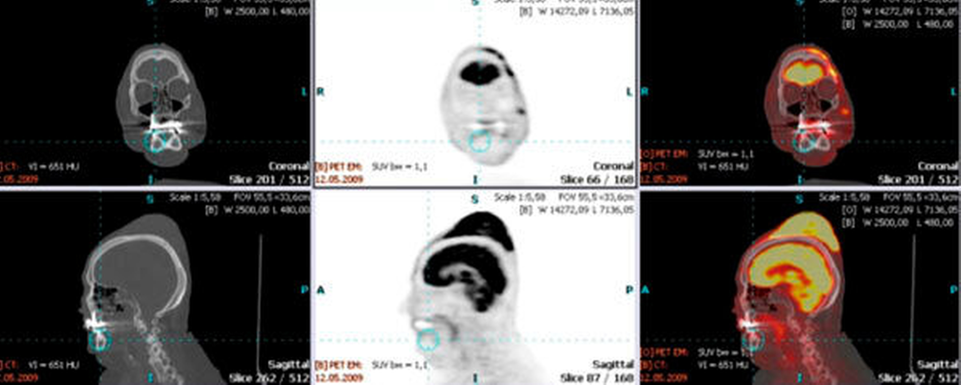 Im MRT zeigte sich eine occipital gelegene, ausgedehnte Raumforderung (Abbildung 4), die im PET-CT zum komplementierenden Staging mit einem Standard-FDG-Uptake (SUVmax) von 19.4 bestätigt wurde. Es ergaben sich keinerlei Hinweise für eine lokoregionäre Metastasierung, Fernmetastasen oder einen Zweittumor (Abbildung 5).