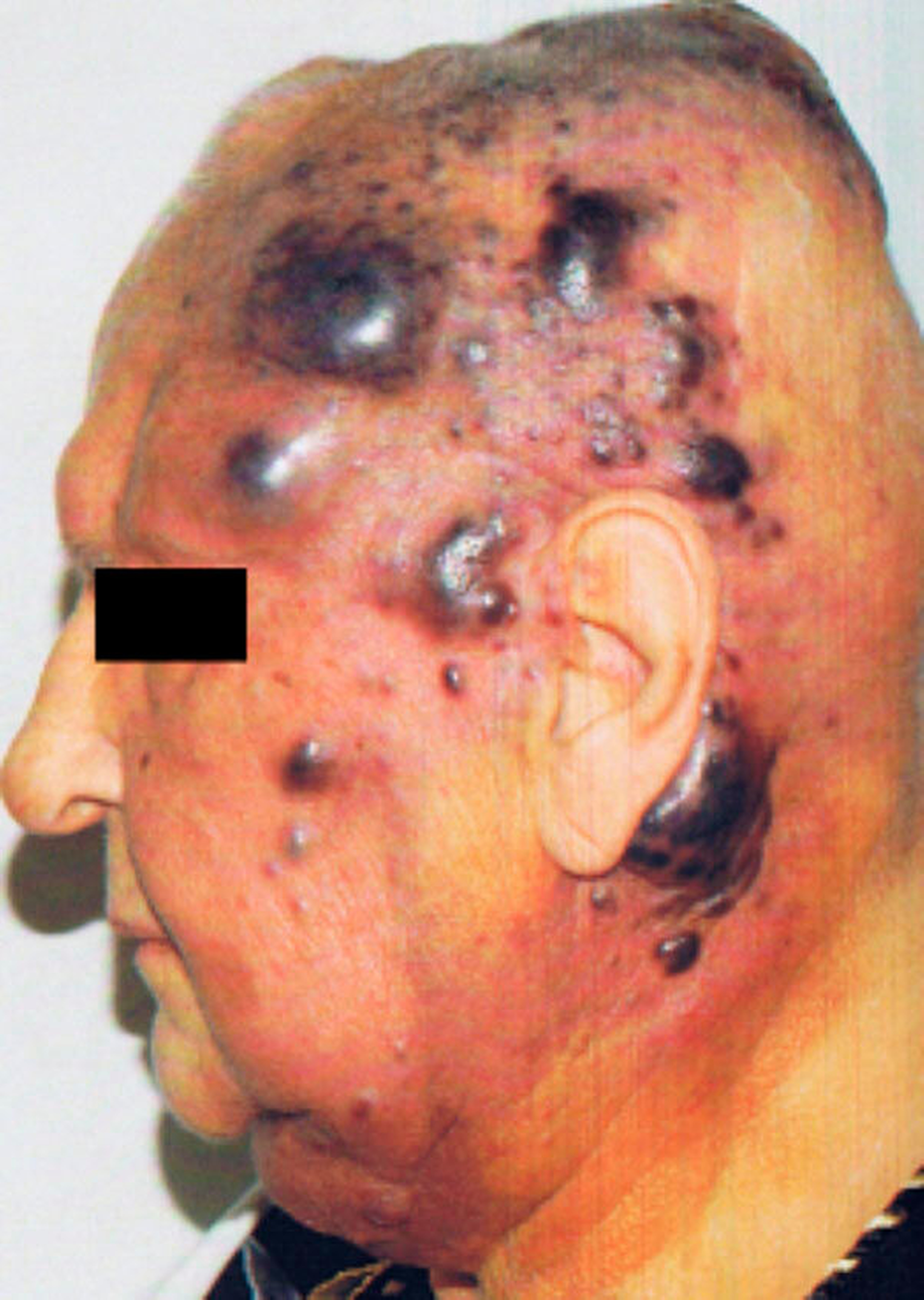 Bezüglich der Überlebensrate berichteten Bernstein et al. in einer retrospektiven Studie mit 50 Patienten mit einem Angiosarkom der Kopf-/Halsregion, dass das Angiosarkom der Kopfhaut eine signifikant schlechtere Überlebensrate hat als das Angiosarkom der Gesichtshaut, was vermutlich auf den verzögerten Diagnosezeitpunkt zurückzuführen ist [Bernstein et al., 2017]. Mit besonderem Blick auf die chirurgische Therapie berichteten Breakey et al., dass die Langzeitprognose signifikant durch eine frühzeitige Diagnose und – ganz besonders – durch eine radikale chirurgische Resektion verbessert werden kann [Breakey et al., 2017].