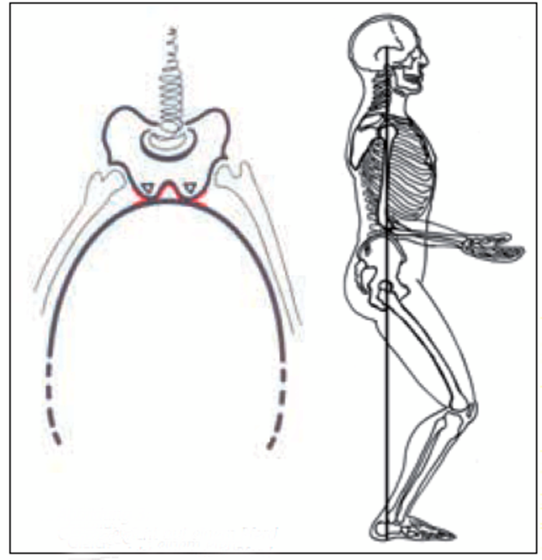 Wegen des spezifischen Designs des Sattelstuhls tendiert das Becken allerdings dazu, sich nach vorne zu neigen, wodurch eine konkave Form der Lendenwirbelsäule erzeugt wird (Abbildung 7 Mittte), was ihre Balance stört und in erheblichem Maß die Kräfte beeinflusst, die auf die Wirbelsäule wirken. Eine konstante Neigung nach vorne, die mit einer Beugung des Rumpfes nach vorne gekoppelt ist, führt oft zu einer Überlastung des gefäßreichen Perineums (Damm) und der Schamregion, Letztere besteht – neben der bedeckenden Haut, die reichlich sensibel innerviert ist – hauptsächlich aus Muskeln des Beckenbodens.