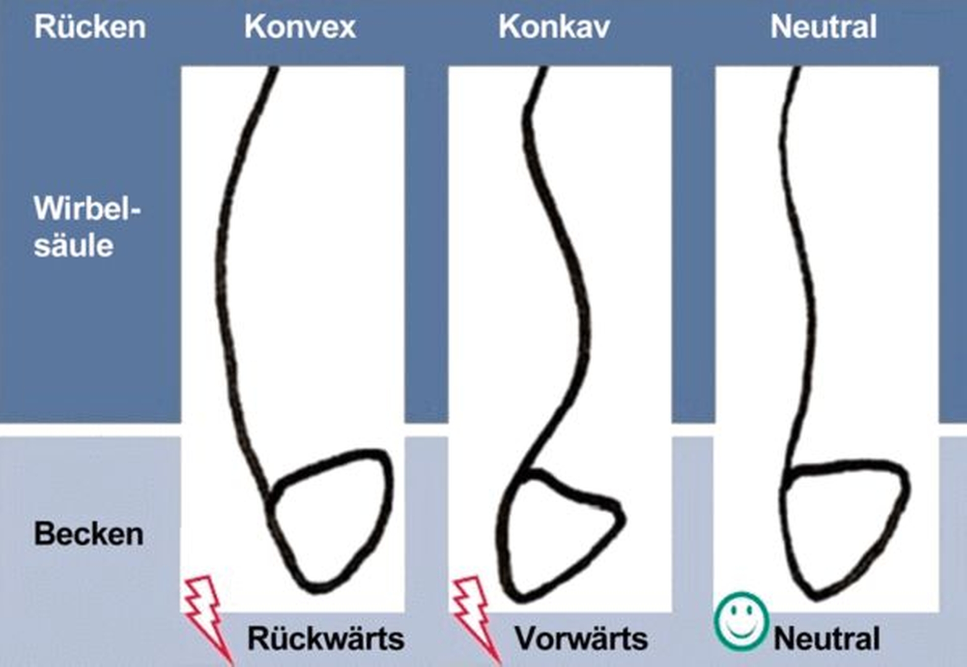 Die permanente Fixierung der Oberschenkel auf dem Sattel und die feste Stabilisierung der Füße auf dem Boden mit einer hohlkreuzartigen Änderung im Lumbalbereich der Wirbelsäule als Folge.