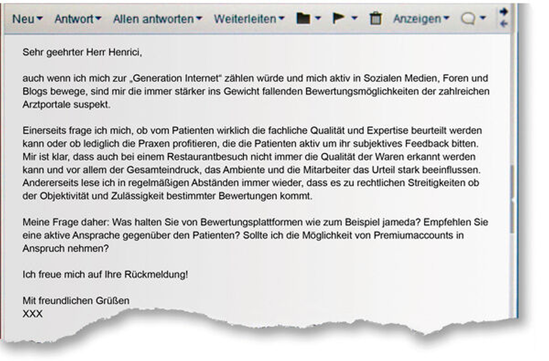 Seien Sie sich im ersten Moment darüber bewusst, dass – Stand 7. Februar – jede neue Praxis automatisch auf jameda erfasst und zur Bewertung freigegeben wird. Um nicht Opfer einzelner schlecht gelaunter Patienten zu werden, bietet es sich an, den Patienten nach der Behandlung um eine kurze Bewertung auf der Plattform zu bitten. So können Sie sich sicher sein, dass Sie ein unmittelbares Feedback in einem zeitlich relevanten Abstand erhalten. Theoretisch.