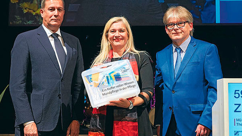 Zum Start der Initiative „Mundpflege in der Pflege“ übergaben Berger und Schott Gesundheitsministerin Huml den neuen Schulungskoffer von BLZK und KZVB, der für Zahnärzte konzipiert wurde, die Pflegepersonal in die Mundhygiene von Pflegebedürftigen einweisen. Der Koffer enthält einen Mustervortrag, Mundhygieneprodukte und verschiedene Informationsmaterialien zur Mundgesundheit. „Die Aufrechterhaltung eines eigenverantwortlichen und selbstständigen Lebens ist eines meiner Hauptziele für Seniorinnen und Senioren“, erklärte Huml. Dazu leistet der Lehrkoffer aus ihrer Sicht einen wichtigen Beitrag.