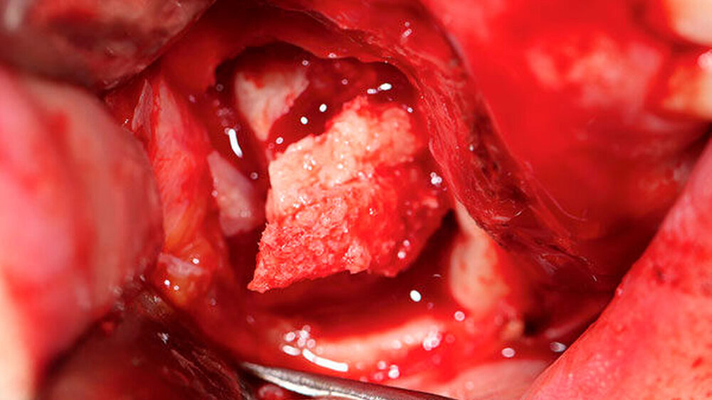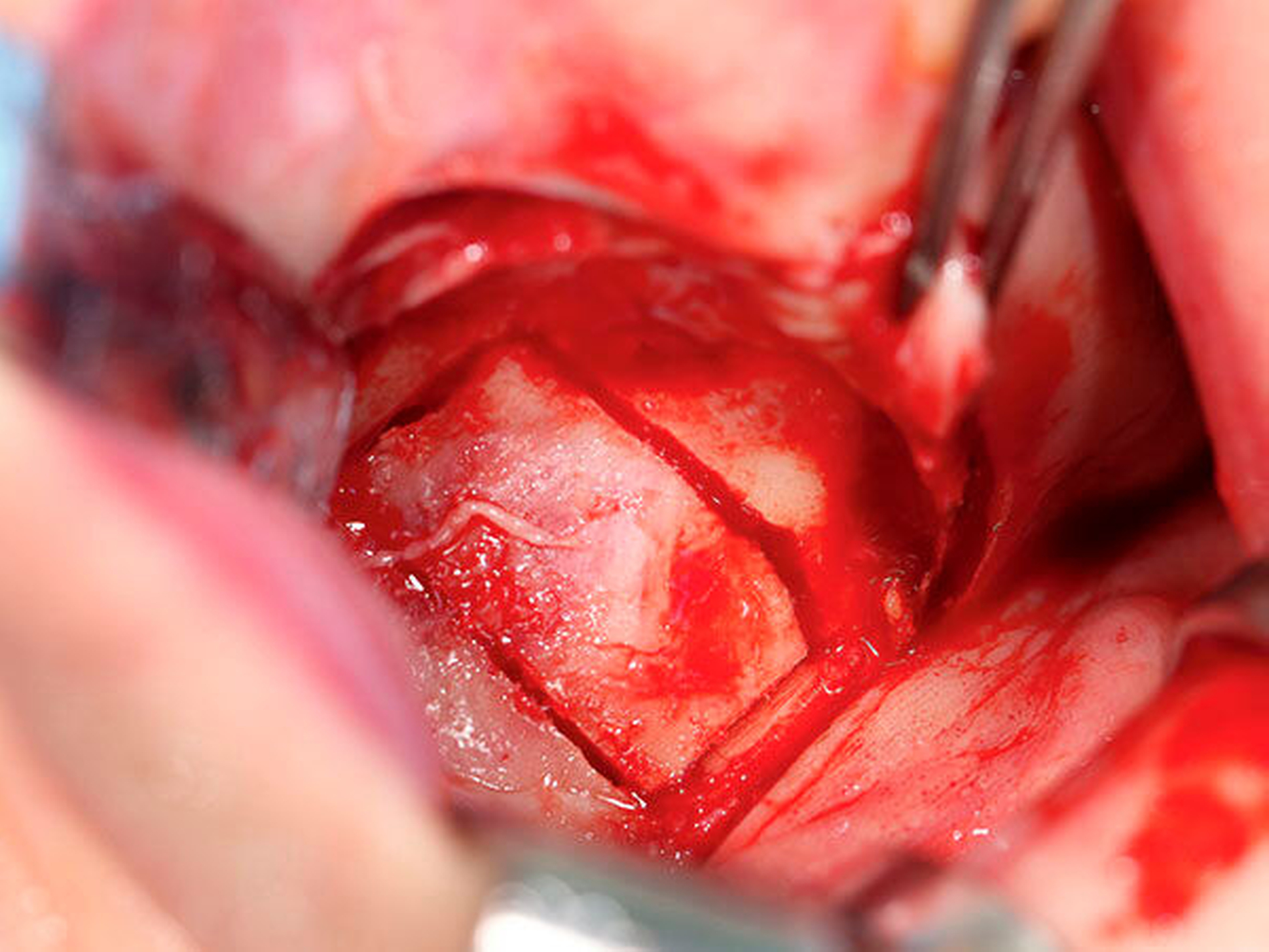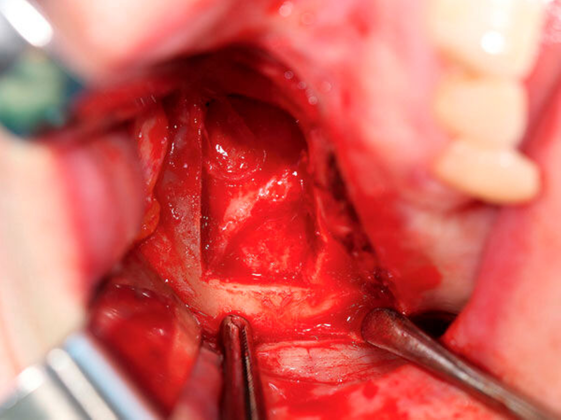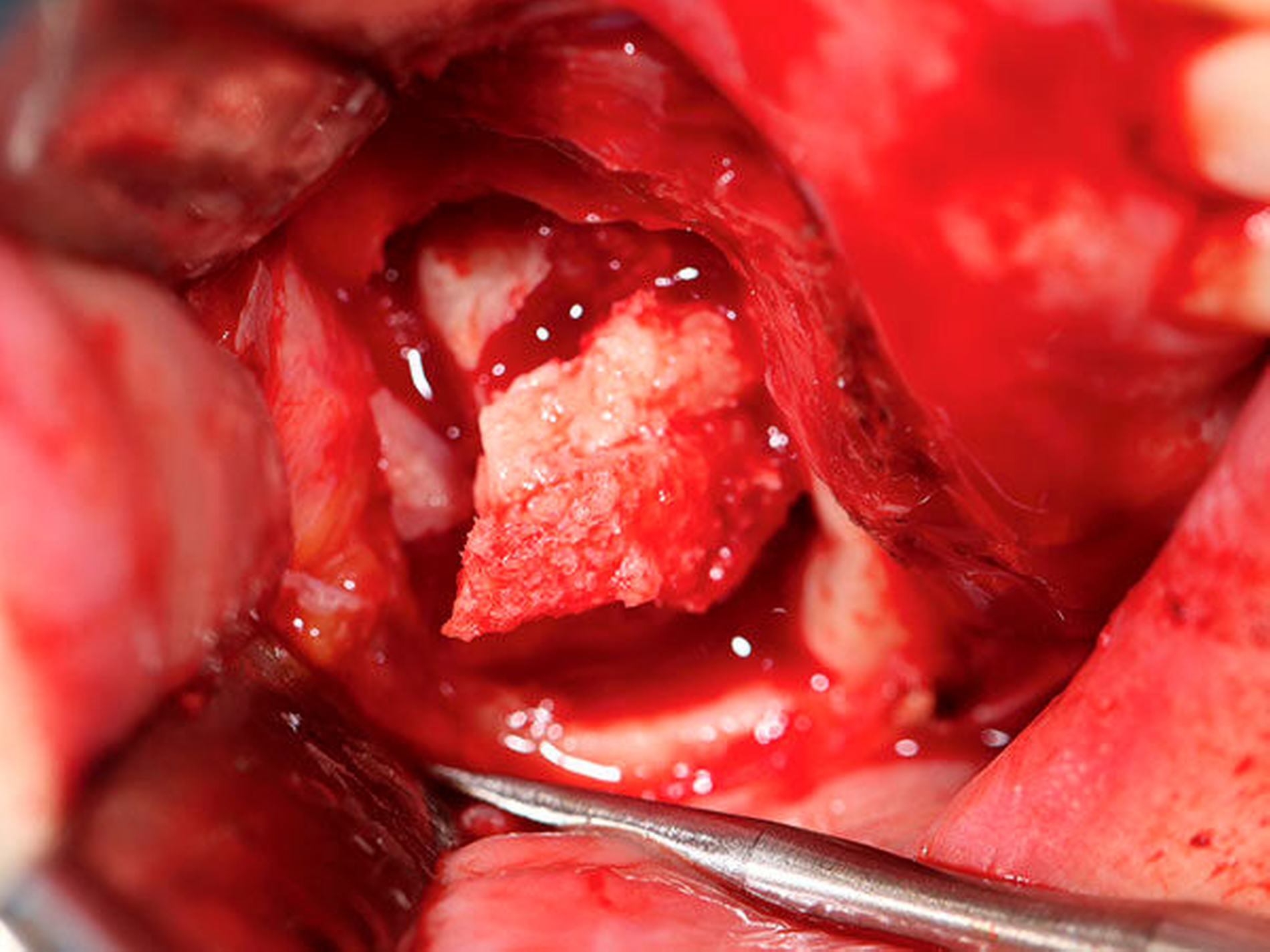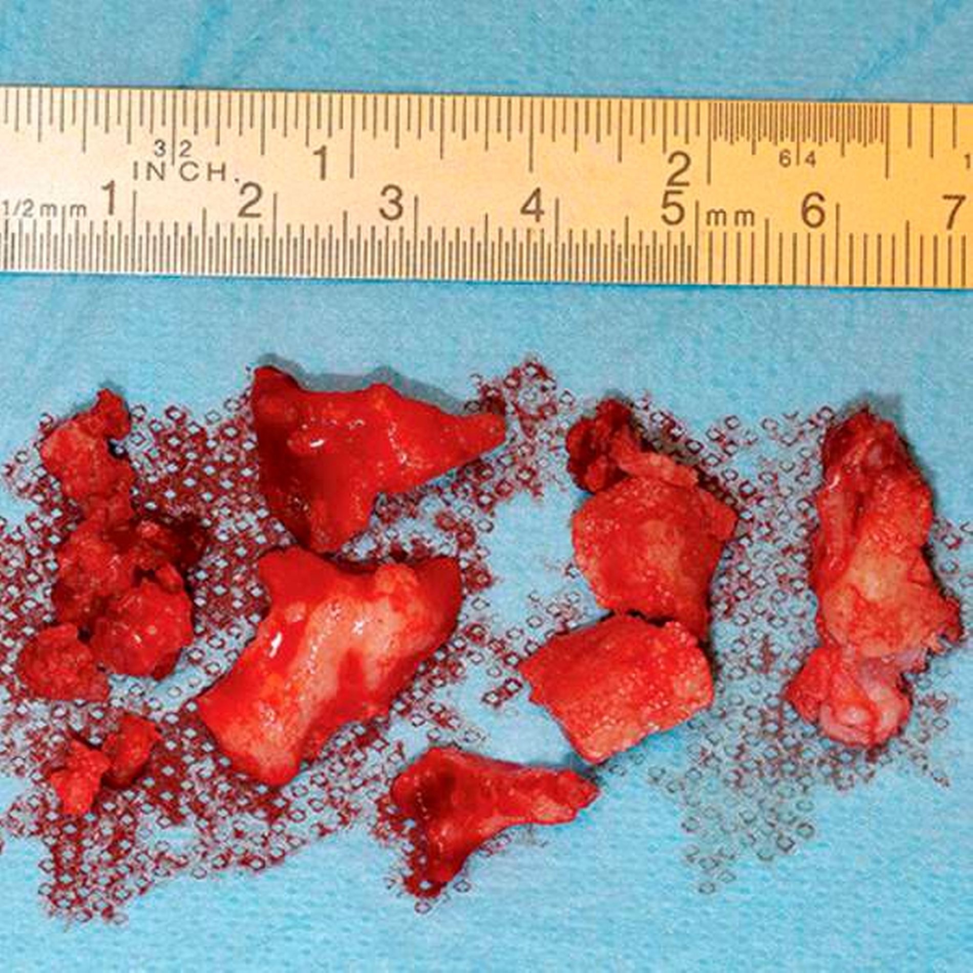 Bei Vorliegen einer Raumforderung der rechten Kieferhöhle unklarer Genese stellte der behandelnde Chirurg die Indikation zur Exzision des Befunds in Intubationsnarkose. Zur Darstellung der vorderen Kieferhöhlenwand wurde im Bereich 12 bis 15 paramarginal inzidiert und der Sinus maxillaris mittels eines gefensterten Zugangs eröffnet. Es stellte sich eine, die gesamte rechte Kieferhöhle ausfüllende, knöcherne Struktur dar (Abbildung 4). Nachdem der Befund aufgrund seiner Größe separiert worden war, wurde er geborgen (Abbildung 5) und zur pathologischen Untersuchung eingesandt (Abbildung 6). Teile der medialen Kieferhöhlenwand und des Orbitabodens waren durch die vorliegende Strukturveränderung resorbiert. Nach Spülung der Wunde und endoskopischer Sicherung einer offenen Verbindung zum mittleren Nasengang wurde dort zur Retention der Abflusswege eine Tamponade eingelegt und über das rechte Nasenloch ausgeleitet.