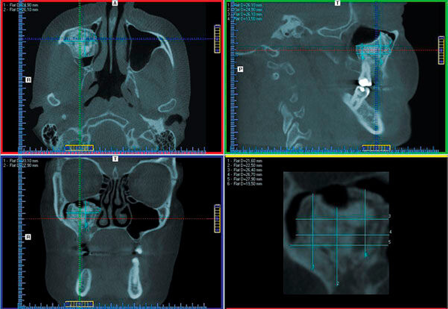 Eine 51-jährige Patientin wurde durch ihren Zahnarzt mit der Frage nach weiterführender Diagnostik an die Abteilung für Mund-, Kiefer, und plastische Gesichtschirurgie der Universität Mainz überwiesen. 14 Tage zuvor war die Frau mit einer rechtsseitigen Schwellung der Wange erwacht, woraufhin sie sich bei ihrem Hauszahnarzt vorstellte. Bei Vorliegen eines Fossa-canina-Abszesses wurde durch den Zahnarzt eine Inzision der Abszesshöhle und die Extraktion der schuldigen Zähne 14 und 16 durchgeführt. In der erstellten Panoramaschichtaufnahme (PAN) fiel ihm eine röntgendichte Raumforderung der rechten Kieferhöhle auf, die von der Universitätsmedizin untersucht werden sollte. Die Anamnese und die klinische Untersuchung zeigten sich unauffällig, so dass zwecks weiterer diagnostischer Analyse eine 3-D-Aufnahme (DVT) des Gesichtsschädels durchgeführt wurde (Abbildungen 1 bis 3).