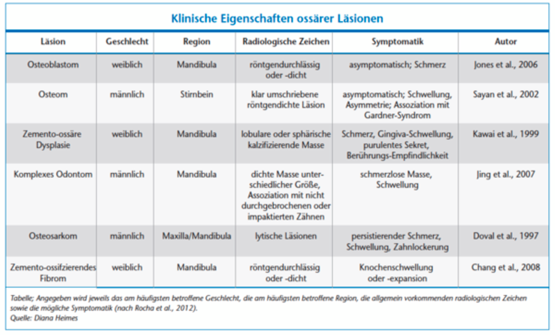 Innerhalb dieser Tumorentität lassen sich zwei Entstehungsformen unterscheiden: zum einen das periostale/periphere und zum anderen das endosteale/zentrale Osteom. Ersteres hat seinen Ursprung im oberflächlichen Knochen, während Letzteres aus dem Knochenmark entsteht [Rocha et al., 2012]. Periphere kranio-faziale Osteome entstehen häufig innerhalb der Nasennebenhöhlen, wobei auch andere Lokalisationen – wie der äußere Gehörgang, die Orbita, das Os temporale und der Prozessus pterygoideus – möglich sind [Soni, Bhargava, 2014]. Trotz des teils expansiven Wachstums ist bisher keine maligne Transformation bekannt [Viswanatha, 2012]; differenzialdiagnostisch sind jedoch vor allem benigne und maligne Läsionen ossärer Herkunft, ebenso wie lokalisierte Infektionen auszuschließen (Tabelle).