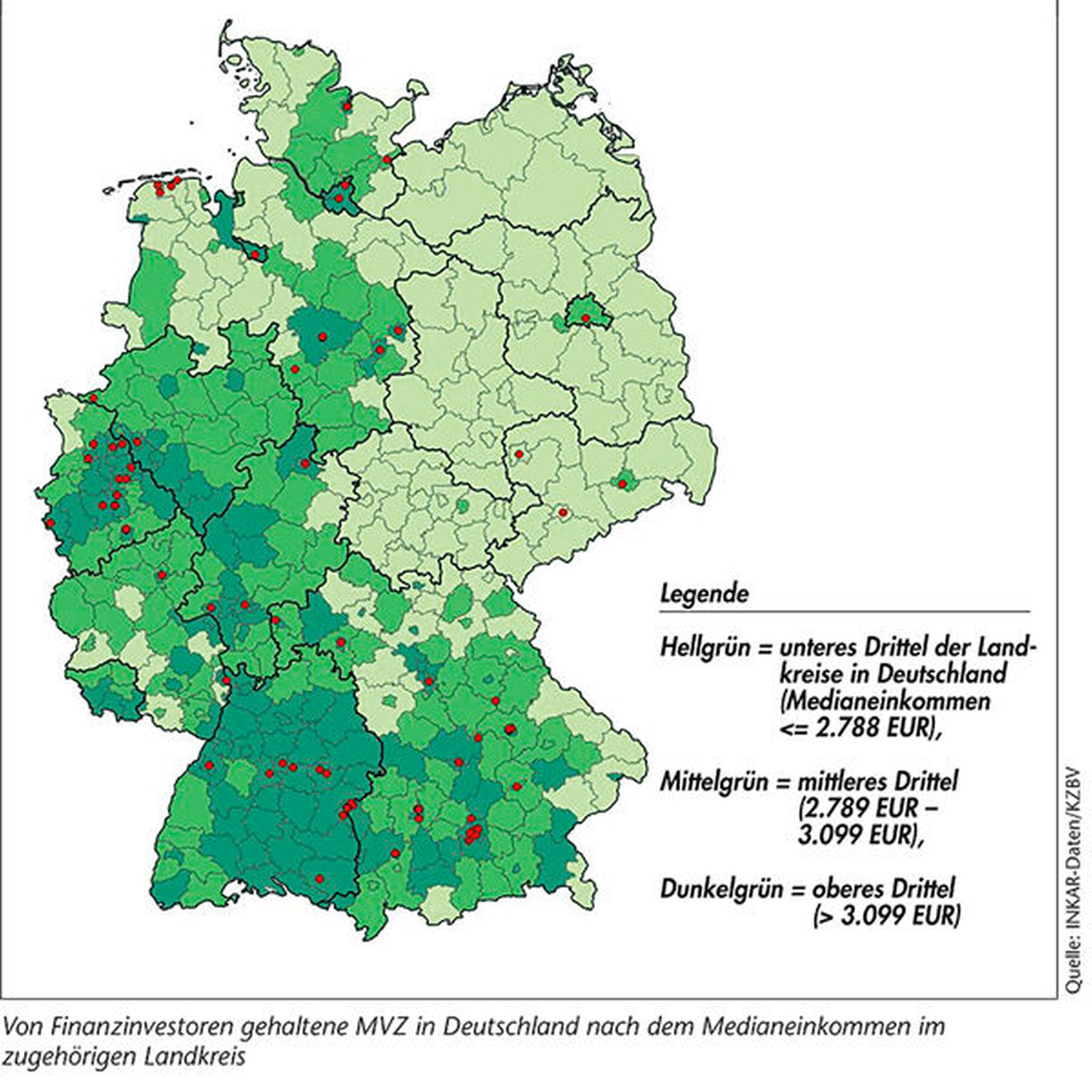 Aber was ist mit dem vermeintlichen Argument, das versorgungsfremde Investoren stets anführen: Eine räumliche Konzentration auf Großstädte und Ballungsräume würde durch sie nicht stattfinden? Insbesondere auf dem Land würden ihre Z-MVZ die Versorgung sicherstellen, ohne sie wäre die ländliche Versorgung in Zukunft gar nicht aufrechtzuerhalten. Vielmehr würde bewusst in ländliche Regionen investiert, auch weil dies ökonomisch Sinn mache. Schließlich sei pro Behandler eine viel größere Anzahl von potenziellen Patienten zu versorgen, das Marktpotenzial weitaus attraktiver.