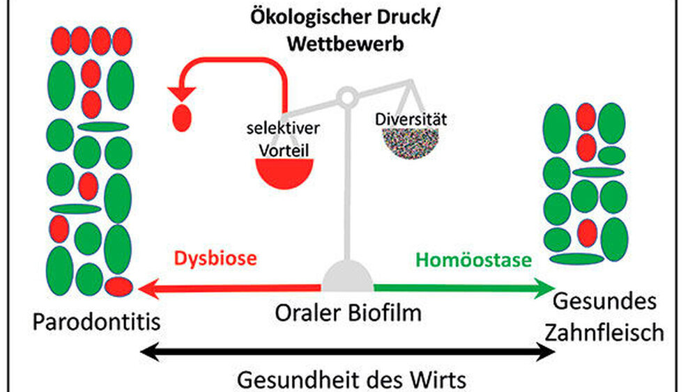 Ein lebenslanger Erhalt der natürlichen Zähne ist bei entsprechender Gesundheit des Individuums, der Zahnhartsubstanz und des Zahnhalteapparats möglich. Kommt es jedoch zu einer Verschiebung der Ökologie der Mundhöhle, speziell im Verhältnis von oralem mikrobiellem Biofilm (dentale Plaque) und der Körperabwehr, können sich Karies, Gingivitis und gegebenenfalls Parodontitis entwickeln [Löe et al., 1965; Von der Fehr et al., 1970]. Nach dem heutigen Verständnis dienen Prävention und Therapie der Gingivitis auch der Prävention der Parodontitis [Sanz et al., 2015]. Die derzeitige Strategie für die Prävention und für die Therapie der Parodontalerkrankungen setzt daher nach wie vor auf die regelmäßige mechanische Entfernung des mikrobiellen Biofilms und seiner mineralisierten Folgeerscheinungen. Dabei ist ein wesentliches Ziel vor allem der häuslichen mechanischen Biofilmkontrolle, das physiologische Gleichgewicht der Mundhöhle zu erhalten beziehungsweise wiederherzustellen (Abbildung 1).
