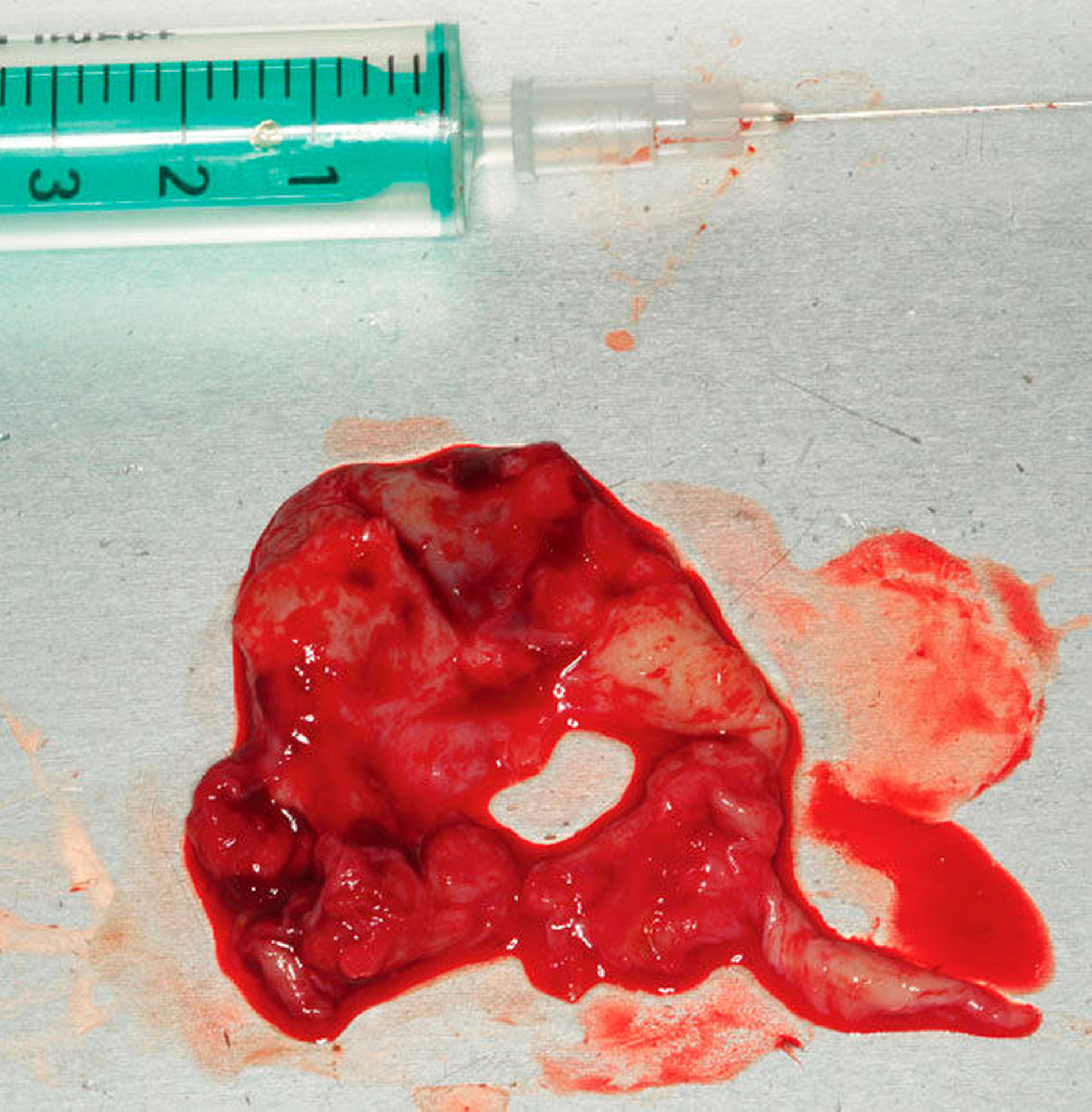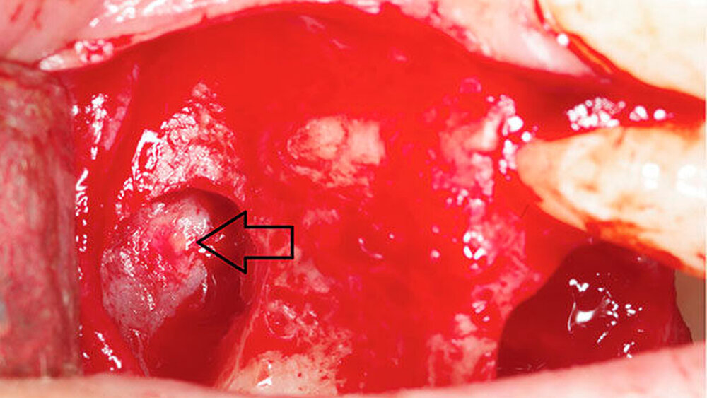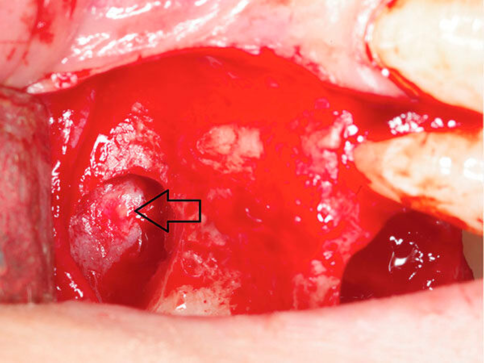 Nach Entfernung des Knochens wurde bereits der durch die Kieferhöhlenschleimhaut schimmernde Fremdkörper sichtbar (Abbildung 2), der gemeinsam mit einem Teil der deutlich verdickten Schleimhaut entfernt wurde. Bei der anschließenden Inspektion der Kieferhöhle imponierte eine Ansammlung von zystischem Granulationsgewebe, das ebenfalls entfernt und zur histopathologischen Aufbereitung eingesandt wurde (Abbildung 3). Die Kieferhöhle wurde endoskopisch nach Granulationsresten untersucht und durch Spülung gereinigt. Da das Ostium naturale weit offen war, konnte auf eine Infundibulotomie verzichtet werden. Das faziale Fenster wurde mit einer resorbierbaren Membran mit langer Standzeit verschlossen, das Periost geschlitzt, Fenster und Alveole plastisch gedeckt (Abbildung 4). Der Patientin wurden zusätzlich ein orales Antibiotikum, abschwellend wirkende Nasentropfen und Analgetika rezeptiert. Überdies wurde auf ein zweiwöchiges Schneuzverbot hingewiesen. Die histopathologische Untersuchung ergab unspezifische granulomatöse Infiltrate mit ausgedehnten Nekrosen sowie septierte Hyphen im Sinne eines Aspergilloms. Der Fremdkörper entsprach wie erwartet einem Materialrest der Wurzelfüllung. Die Patientin wurde in einen engen ambulanten Recall eingebunden. Die Nahtentfernung erfolgte nach zehn Tagen. Nach drei Monaten kam die beschwerdefreie Patientin zur Kontrolle.