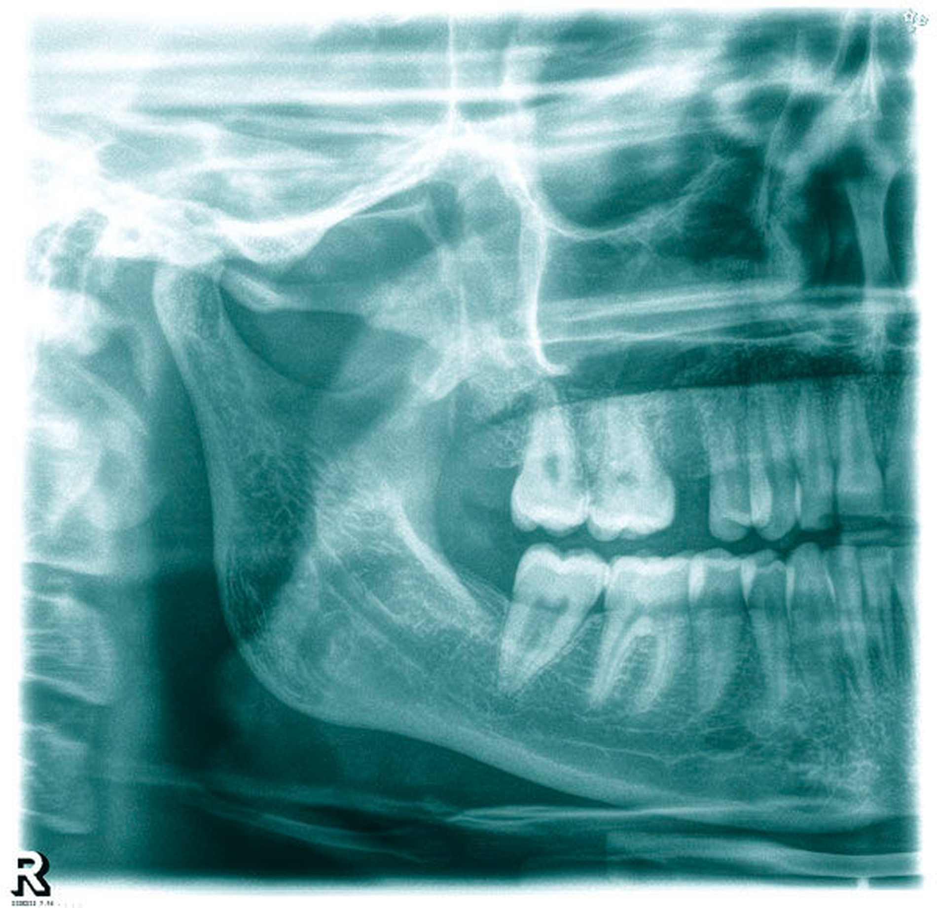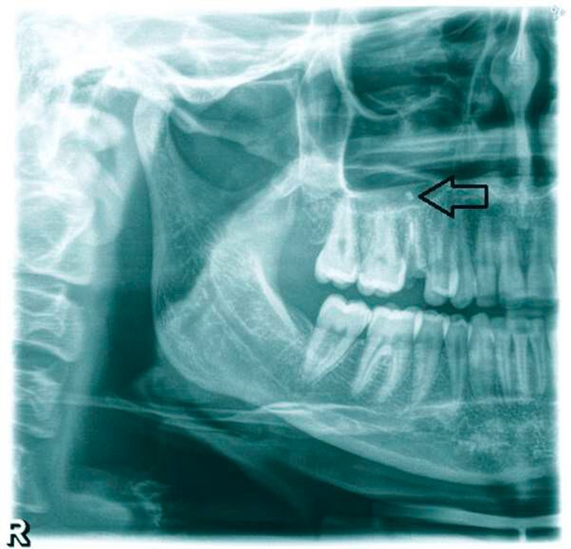 Die 21-jährige Patientin hatte bei ihrem Hauszahnarzt eine Revision der Wurzelfüllung an Zahn 15 erhalten. Dabei wurde akzidentiell Wurzelfüllmaterial über den Apex in die Kieferhöhle luxiert. Zu diesem Zeitpunkt war die Patientin beschwerdefrei. Der Hauszahnarzt überwies die Patientin in eine HNO-Klinik mit der Bitte um Fremdkörperentfernung. Dort wurde versucht, den Fremdkörper endoskopisch über das Ostium naturale zu entfernen. Da dies nicht gelang, wurde die Patientin zur weiteren Therapie in eine oralchirurgische Praxis überwiesen. Ein Termin für die geplante Operation wurde zeitnah vereinbart, aber von der Patientin nicht eingehalten.