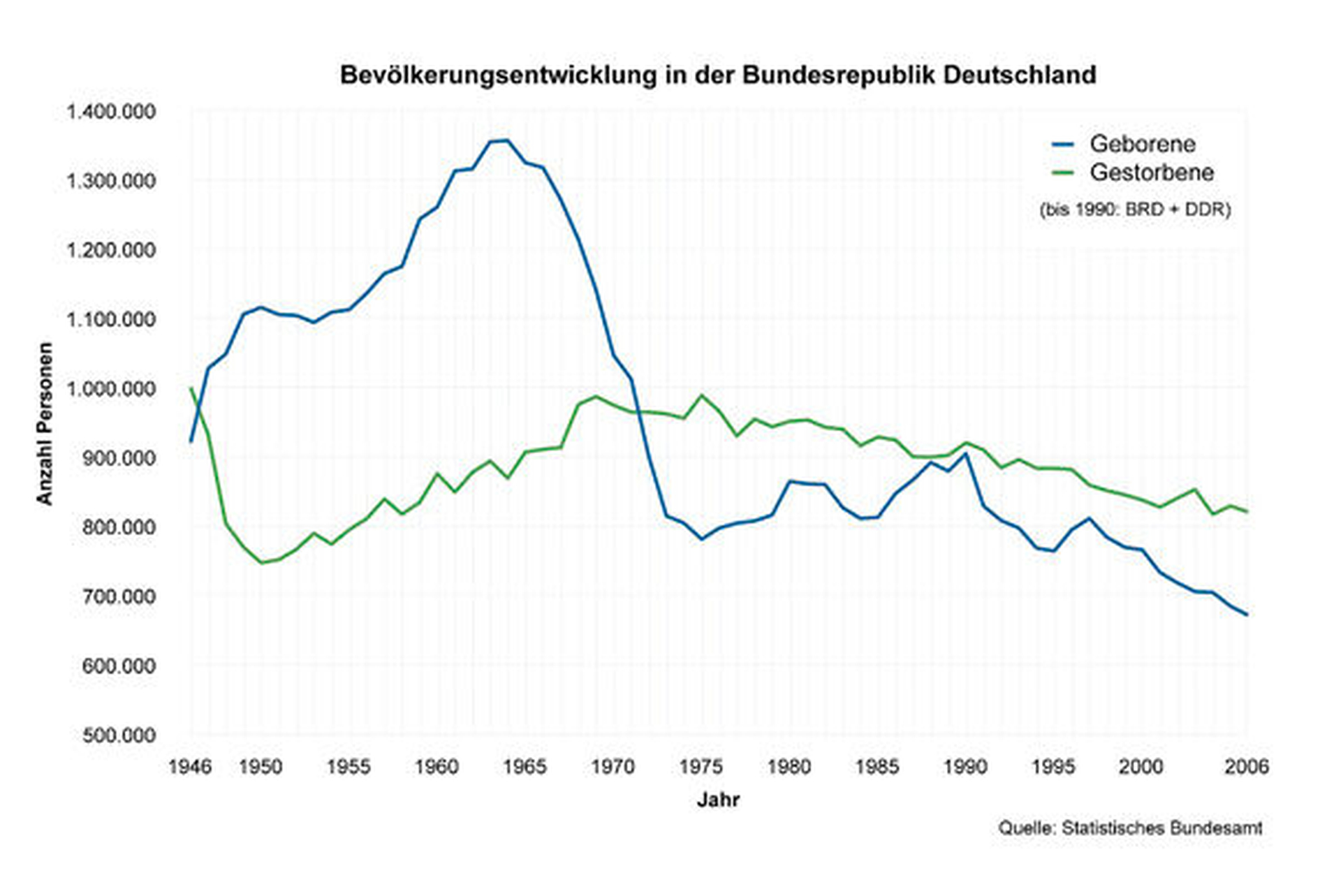 Herleiten möchte ich sie aus der Historie. Im 20sten Jahrhundert gab es in mehreren westlichen Ländern geburtenstarke Jahrgänge, die sogenannten Babyboomer. Darunter die geburtenstärksten Jahrgänge waren in den USA wie auch in Deutschland die Generation, die in den Jahren von 1955 bis 1965 das Licht der Welt erblickte, in Deutschland waren es grob die Jahre 1957 bis 1967. In dieser Zeit lag die Geburtenziffer (Anzahl der Kinder einer Frau im Laufe ihres Lebens) bei circa 2,4 Kindern (Europa: 2,5). Danach sackt – wie der Grafik zu entnehmen ist – die Neugeborenenrate bis zum Jahr 1975 auf fast die Hälfte herab und bleibt ab hier auf einem schwachen Niveau (Geburtenziffer: circa 1,4) konstant.