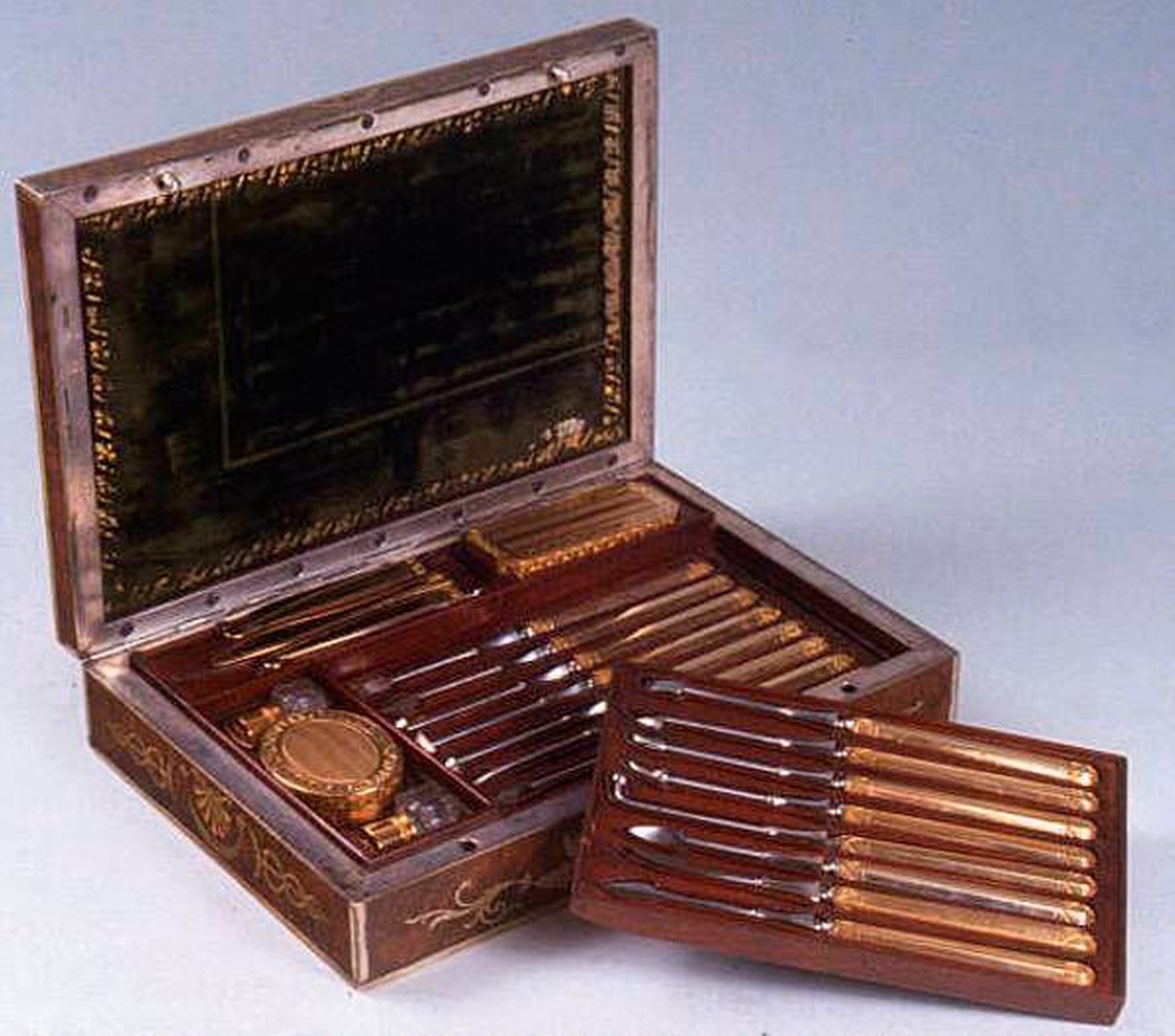 Das Set enthält zwei Tabletts mit je acht zahnärztlichen Instrumenten, die mit einem speziellen Griff angehoben werden können. In weiteren Fächern befinden sich Lanzetten, Pinzette, Schere sowie zwei goldene Boxen und zwei Kristallflakons mit Goldverschlüssen, die der kaiserliche Adler schmückt. Die zahnärztlichen Instrumente werden heute noch in ähnlicher Form verwendet, natürlich nicht so luxuriös verziert. Die Instrumente beinhalteten: Kürette, um einen entzündlichen Zahnhalteapparat zu behandeln, Scaler, um Zahnstein zu entfernen, sowie Stopfer für Füllungen und einen Kauter, um die Wunden oder Verletzungen zu kauterisieren.