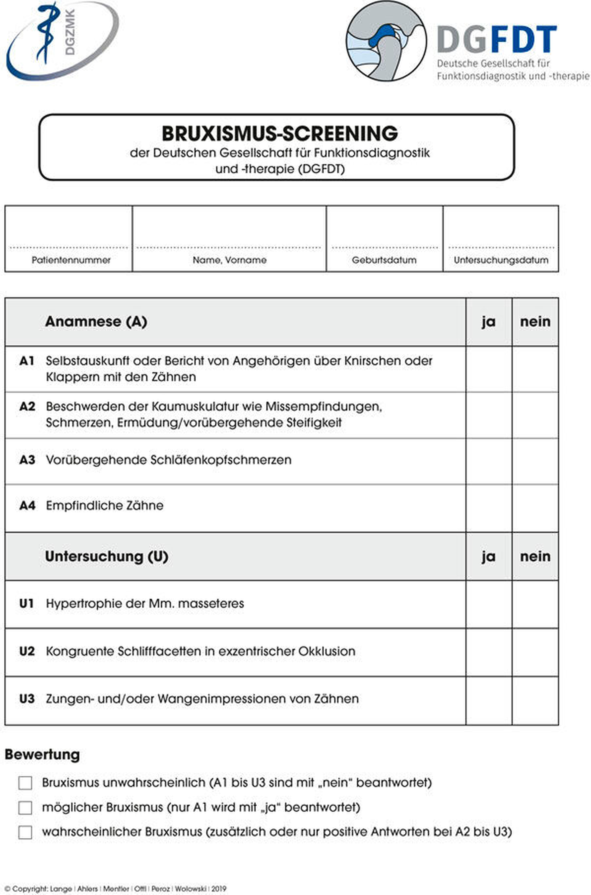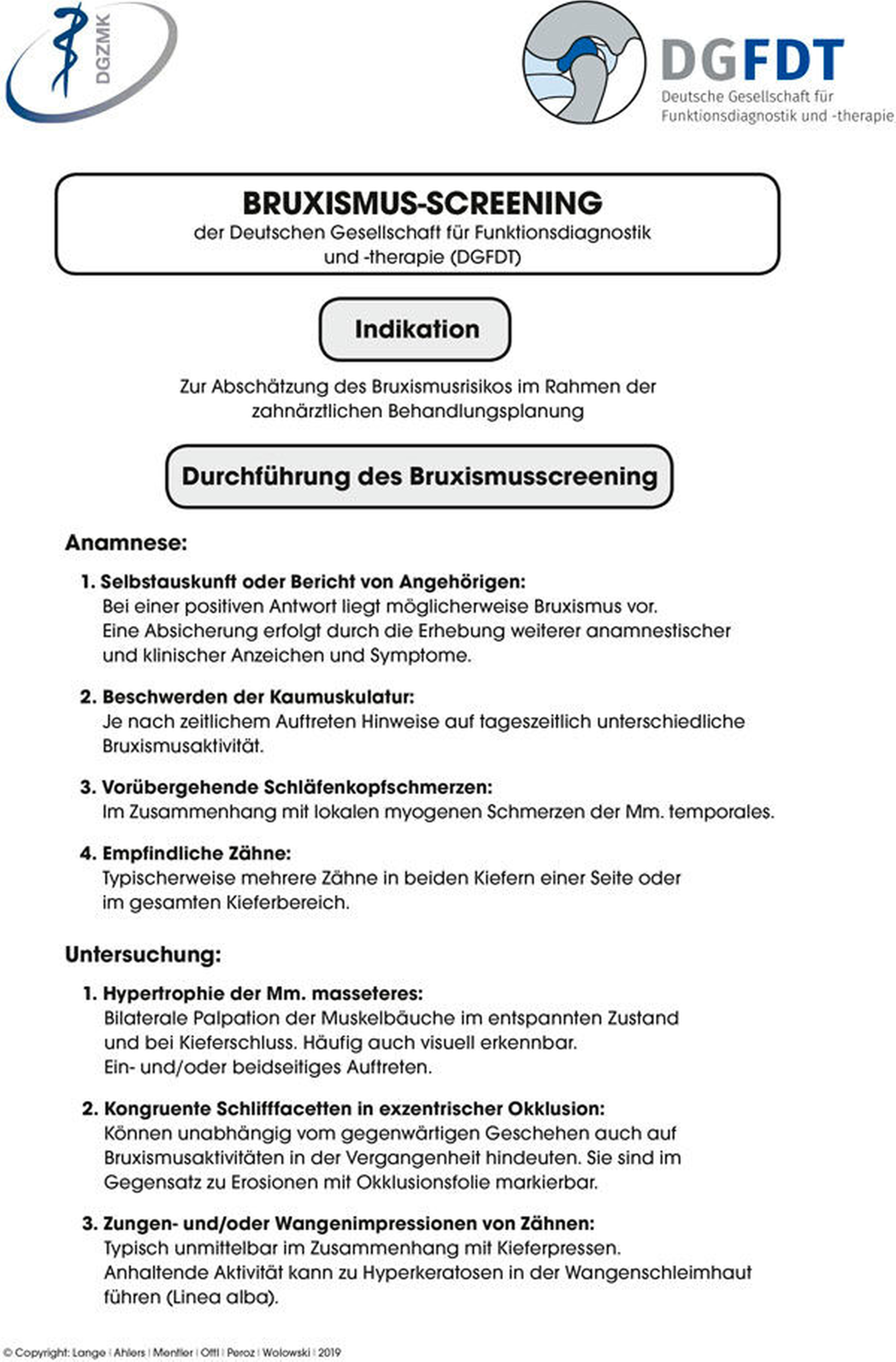 Die Anamnese allein sollte nicht zur Diagnostik von Schlaf- oder Wachbruxismus genutzt werden [Casett et al., 2017; Palinkas et al., 2015; Raphael et al., 2015]. Die Leitlinie empfiehlt, die Kriterien der American Association for Sleep Medicine (AASM) f ü r Schlafbruxismus zu nutzen [Palinkas et al., 2015; Raphael et al., 2015]. Diese Kriterien helfen, neben der Anamnese auch klinische Anzeichen zu beurteilen, wie einen abnormen, nicht kariösen Zahnhartsubstanzverlust und/oder den Verlust von Restaurationsmaterialien, Missempfindungen, M ü digkeit oder Schmerz in der Kaumuskulatur und Kiefer ö ffnungsbehinderungen beim Aufwachen sowie die Hypertrophie des M. masseter bei willk ü rlichem, kr ä ftigem Kieferpressen. Die Deutsche Gesellschaft f ü r Funktionsdiagnostik und -therapie stellt ein entsprechendes Bruxismus-Screening online zur Verf ü gung (Abbildung 1, www.dgfdt.de).