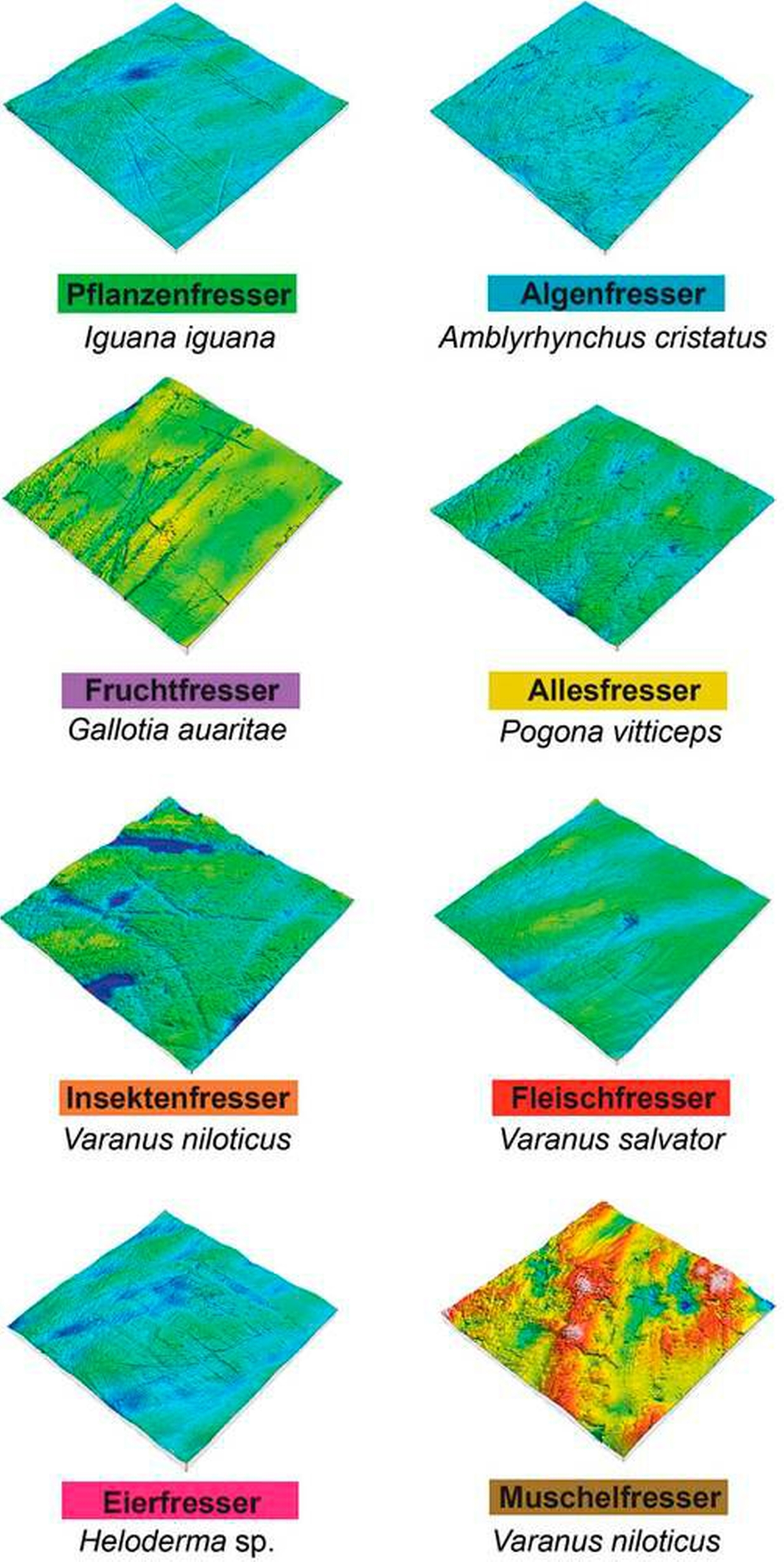 Anhand hochaufgelöster mikroskopischer Aufnahmen der Zahnschmelzoberfläche von Schuppenechsen lässt sich der Untersuchung zufolge erkennen, wovon sich die Tiere ernährt haben. Geforscht wurde dazu unter der Leitung von Wissenschaftlern der Johannes Gutenberg-Universität Mainz (JGU). Zu den untersuchten Echsen zählen unter anderen Leguane, Warane, Eidechsen und Brückenechsen.