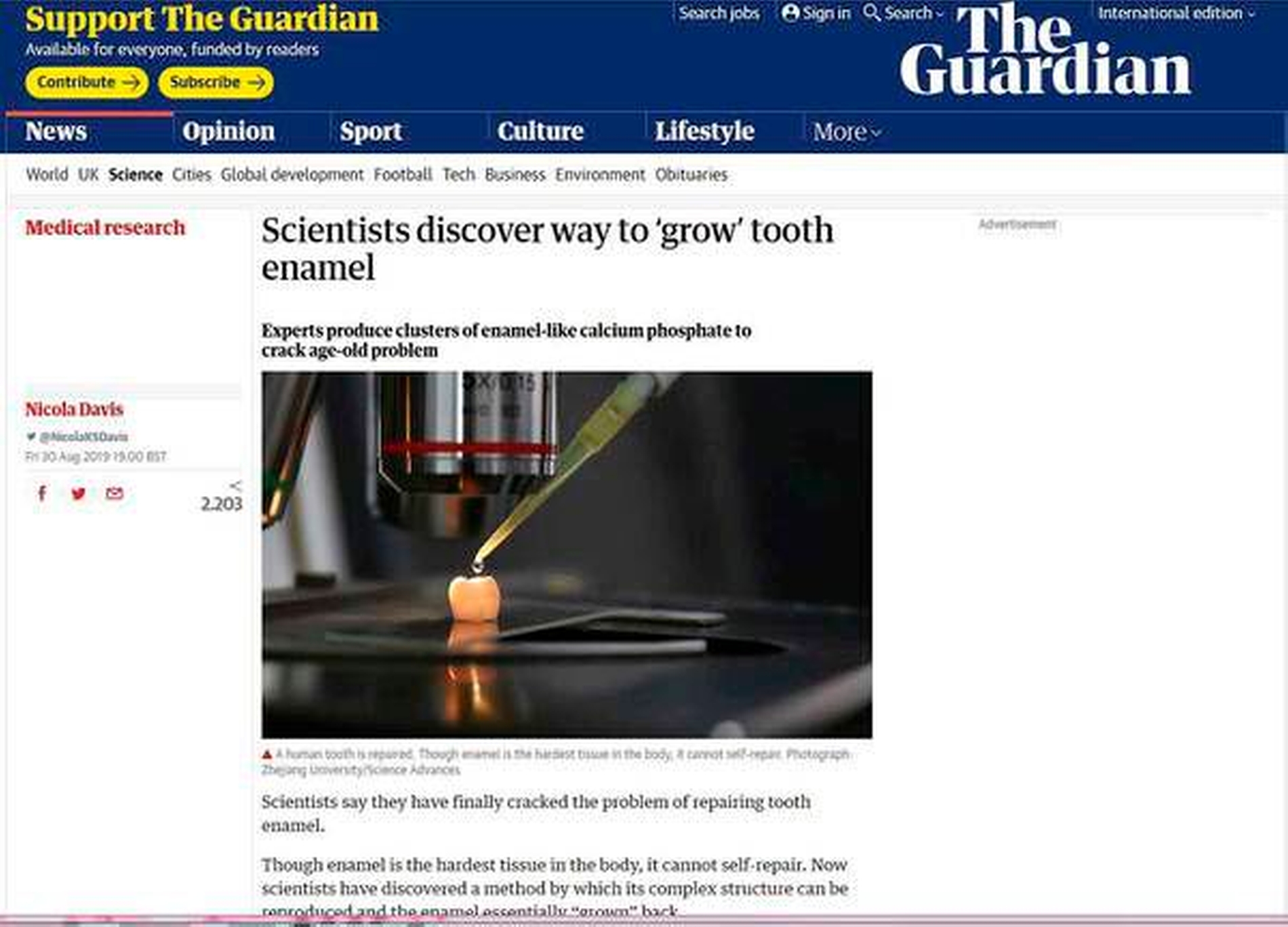 Shao C, Jin B, Mu Z, Lu H, Zhao Y, Wu Z, Yan L, Zhang Z, Zhou Y, Pan H, Liu Z, Tang R (2019): Repair of tooth enamel by a biomimetic mineralization frontier ensuring epitaxial growth. Science Advances, 5(8), eaaw9569