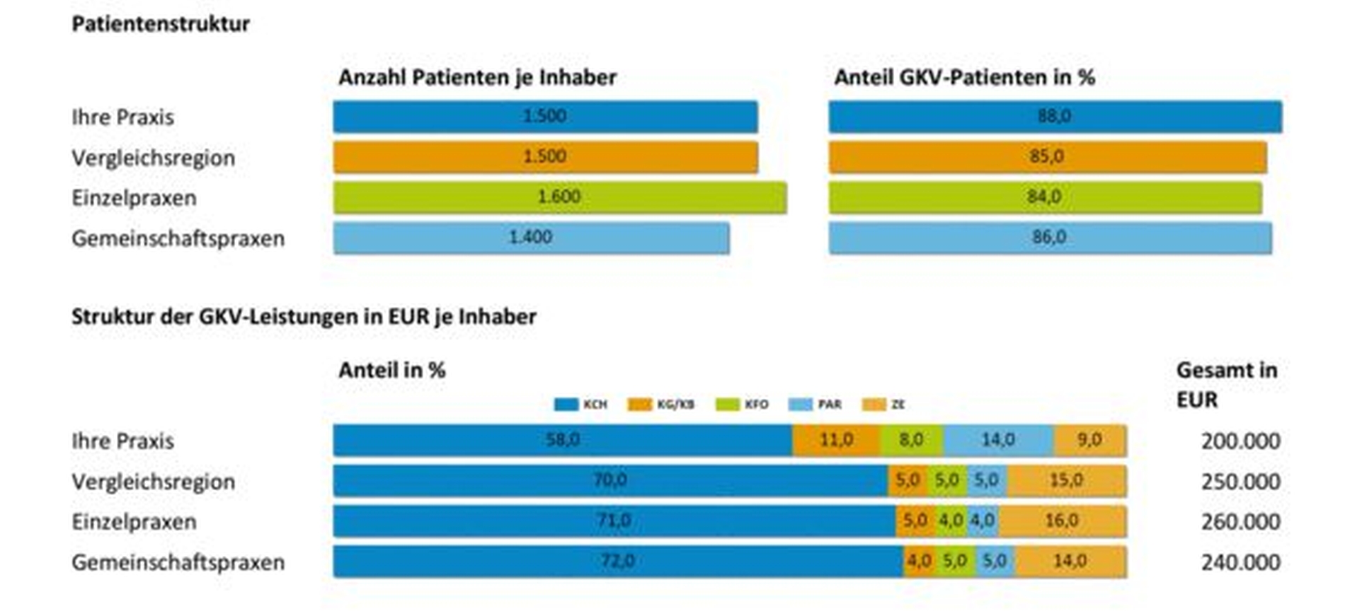 Feedbackberichte, Chefübericht, Finanzplanung: Nach Abschluss der Erhebung erhalten alle Teilnehmer wieder kostenlose Feedbackberichte, in denen die eigenen Daten als individueller Praxisbericht und Chefübersicht aufbereitet sind. Die Chance: Allein dieser Prozess ermöglicht es dem Zahnarzt, sich intensiver mit seinen Praxisdaten zu befassen und seine Expertise zu vergrößern. Geboten wird ein Überblick über die betriebswirtschaftliche Situation der Praxis und er dient zugleich als Kontroll- und Planungsinstrument. Die Chefübersicht wird um die aktualisierten Daten der Erhebung 2019 ergänzt. Sie stellt darüber hinaus die Entwicklung der Kostenstruktur der jeweiligen Praxis anhand von Grafiken und Erläuterungen übersichtlich dar und kann als szenario-orientierte Finanzplanung für die kommenden Jahre eingesetzt werden.