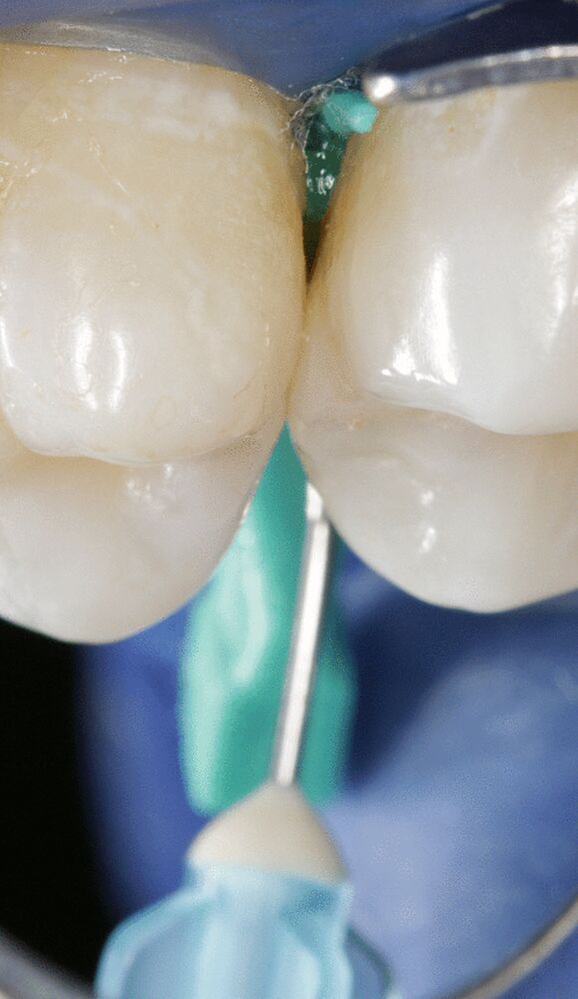 Bisher gibt es ein Produkt zur Kariesinfiltration (Icon, DMG, Hamburg), das alle relevanten Agenzien (HCl-Gel 15 Prozent, Ethanol 99 Prozent und Infiltrant) und ein Keilchen zur Separation enthält. Allerdings sollte vor der Behandlung nach dem Legen von Kofferdam und der Verwendung des Keilchens unbedingt mittels Sondierung [Paris et al., 2019] nochmals darauf geachtet werden, dass nicht versehentlich eine kavitierte Läsion behandelt wird, da selbst Mikrokavitationen nur unzureichend mit dem Infiltranten aufgefüllt werden können und somit die Läsion nur unzureichend arretiert bleibt.