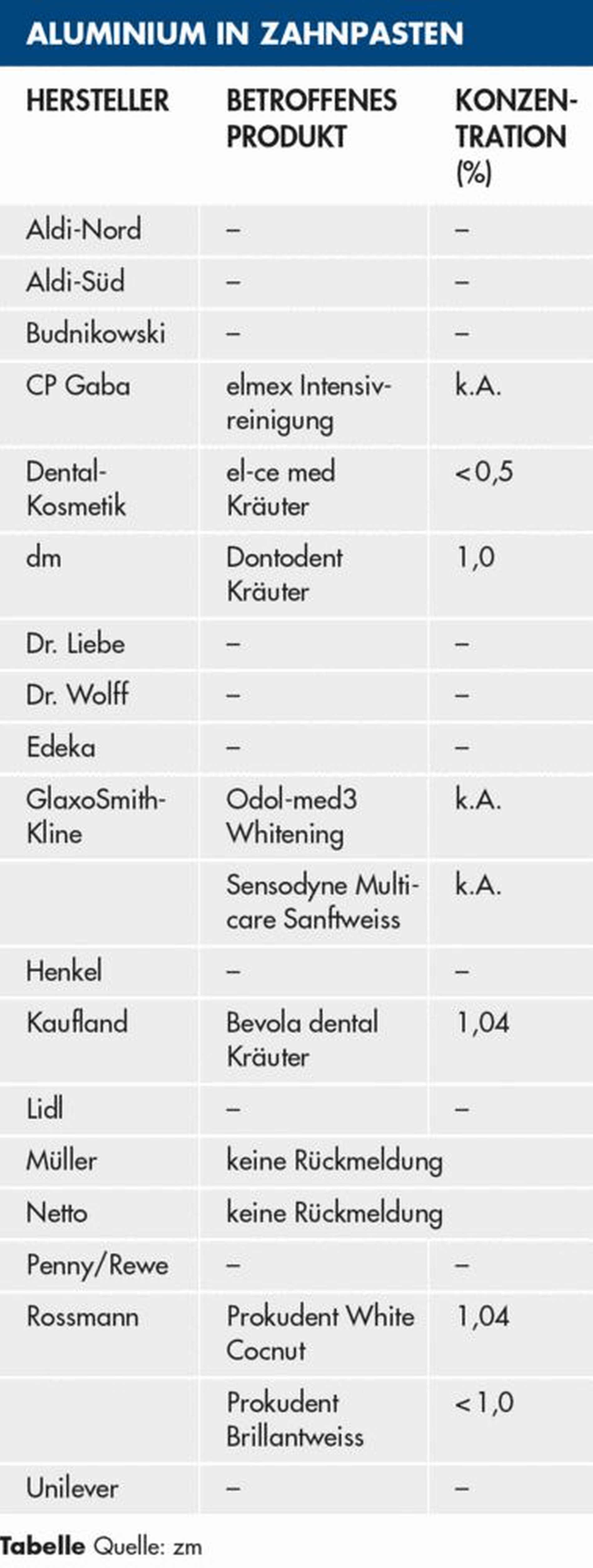 Die zm haben daraufhin die 19 größten Zahnpastahersteller für Deutschland angeschrieben und gefragt, in welchen Zahnpflege-Produkten Aluminiumbestandteile – in welcher Form und in welcher Konzentration – enthalten sind, wie die Studie des Bundesinstituts für Risikobewertung bewertet wird und ob ein Verzicht auf Aluminiumbestandteile in seinen Zahnpflegeprodukten geplant ist. Ergebnis: Zwei Hersteller antworteten nicht, in den Produkten der übrigen ist Aluminium zum Teil enthalten. Dort, wo Hersteller Angaben zur Konzentration machen, allerdings maximal in einem Umfang von 1,04 Prozent.