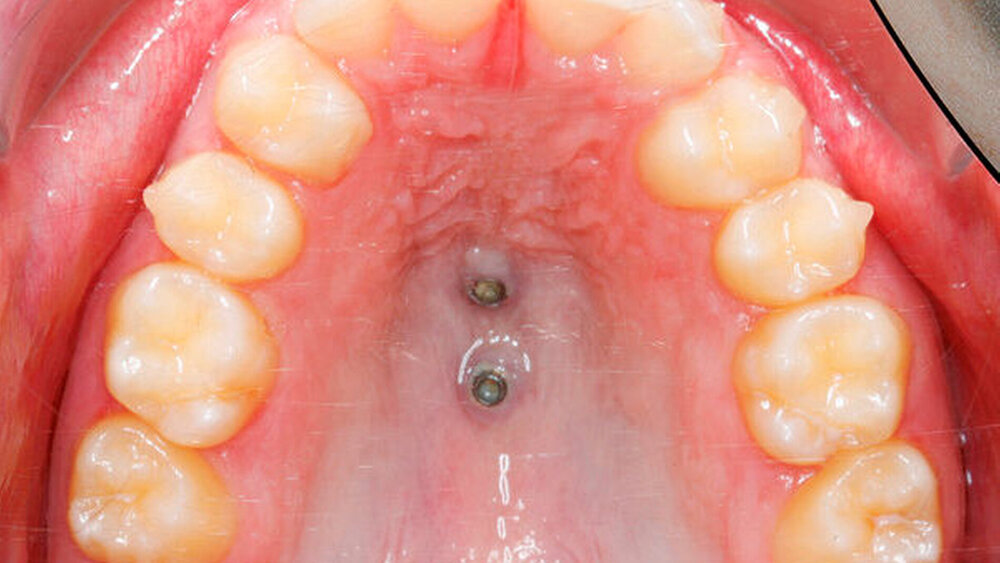 Das zweiphasige Vorgehen wird anhand eines 15-jährigen Patienten mit Aplasie beider oberer seitlicher Schneidezähne dargestellt (Abbildung 1). Die bleibenden oberen Eckzähne waren nach mesial gewandert, während die Milcheckzähne noch persistierten. Von Eltern und Patient wurde der kieferorthopädische Lückenschluss, möglichst mit Alignern, gewünscht. Die Behandlung begann mit dem Anpassen kieferorthopädischer Bänder auf den oberen ersten Molaren sowie der Insertion von zwei Mini-Implantaten (2 x 9 mm und 2 x 7 mm, Benefit, PSM) posterior der dritten Gaumenfalten in der sogenannten T-Zone [Becker, 2019; Wilmes, 2016]. Die Verbindung zu den Prämolaren wurde durch Gleitröhrchen (Tubes) und Klebeverbindungen mittels Composite realisiert (Abbildung 2, B-Mesialslider, [Wilmes, 2018]). Die Milcheckzähne wurden erst unmittelbar nach Einsetzen des Mesialsliders extrahiert, um die Geschwindigkeit des Lückenschusses zu erhöhen (Regional Accelatory Phenomenon – RAP [Verna, 2016]). Nach insgesamt zwölf Monaten sind alle Lücken nach mesial geschlossen (Abbildungen 3 und 4).