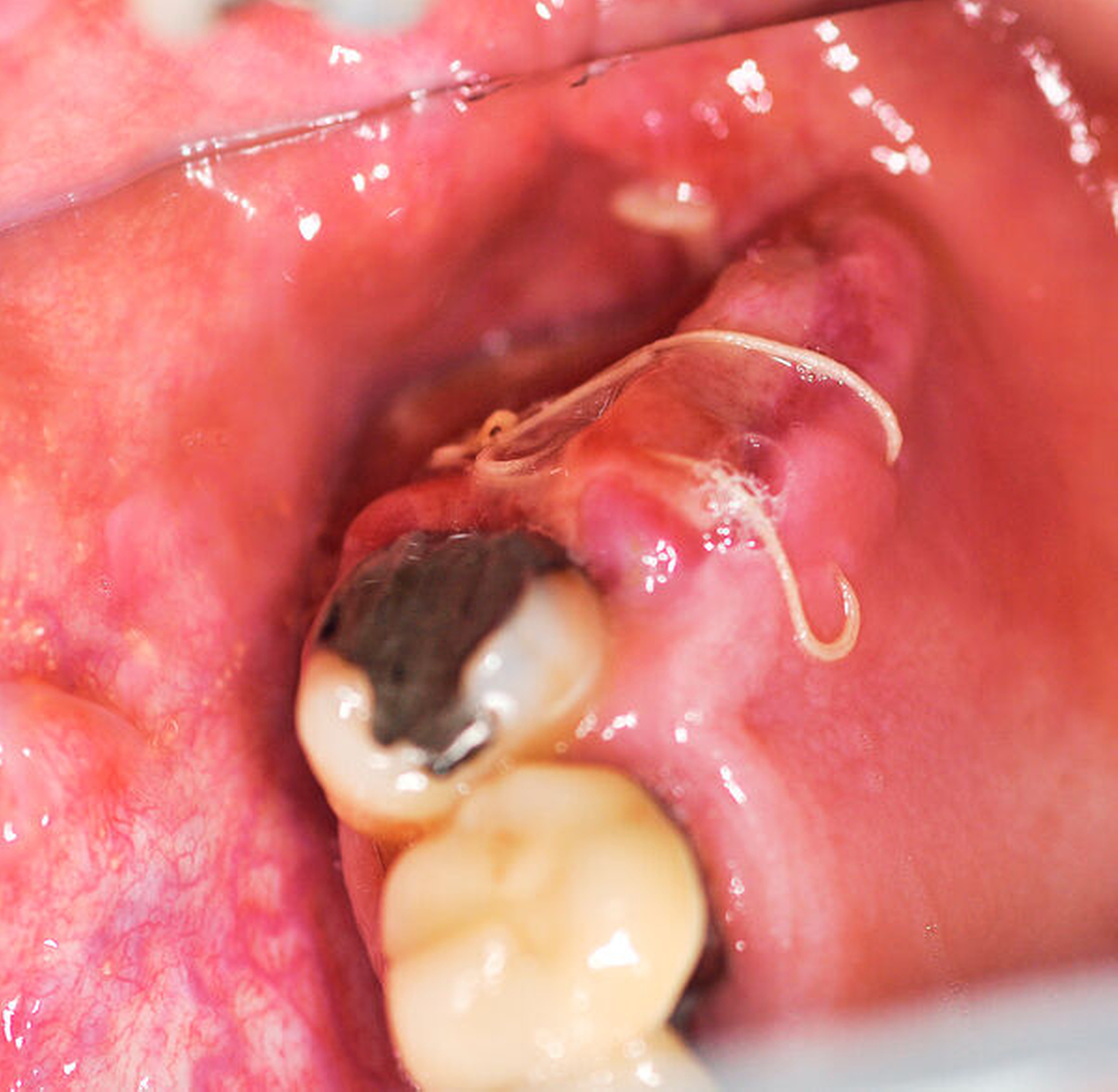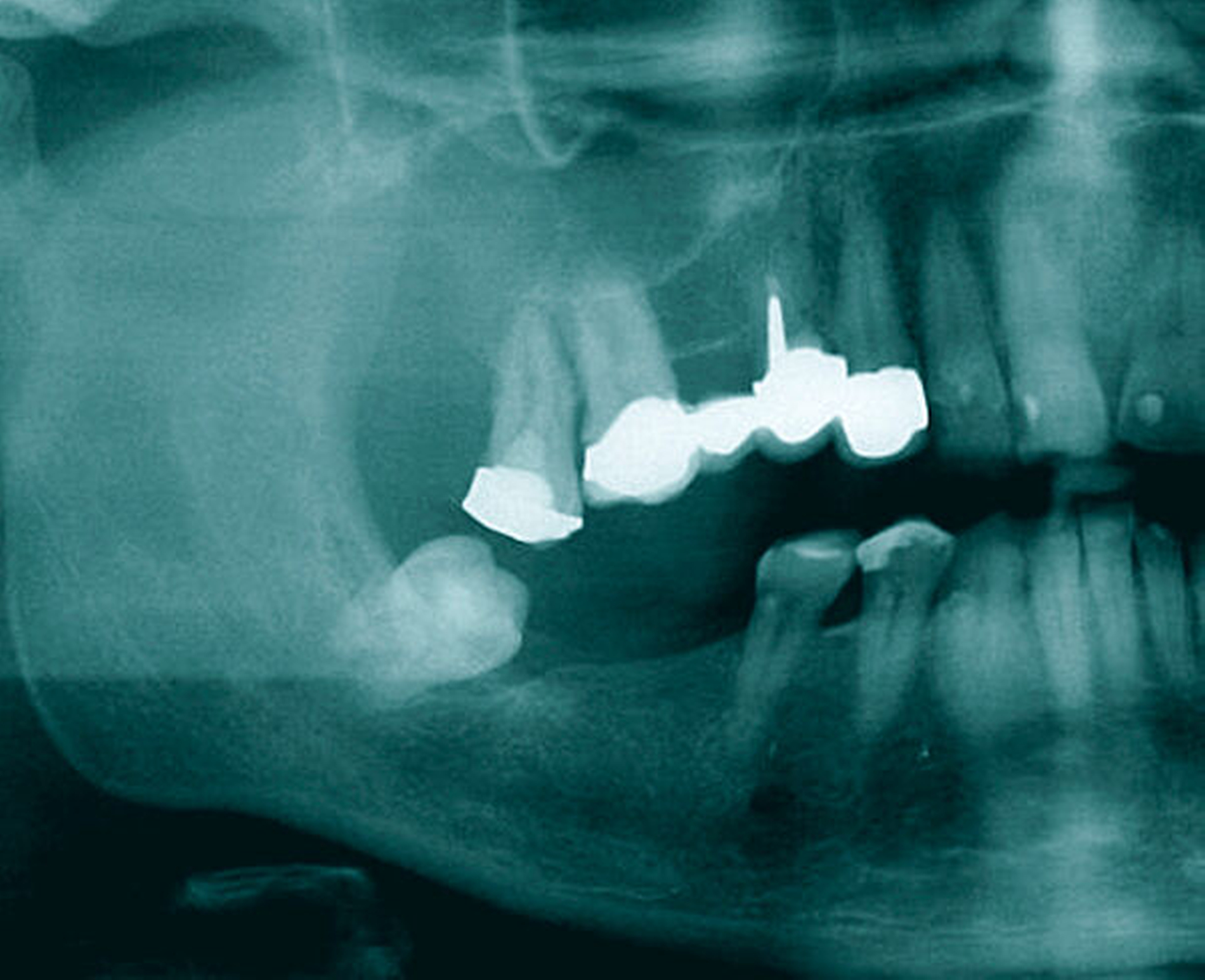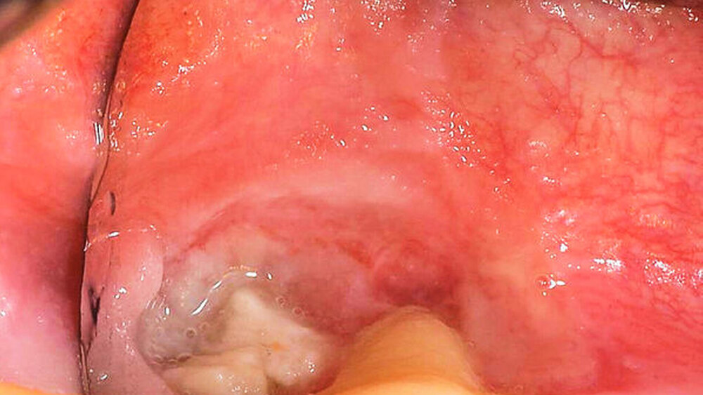 Ein 50-jähriger Patient ohne Nebenerkrankungen und Medikation stellte sich auf Überweisung seines Hauszahnarztes mit einem unklaren, tumorähnlichen Befund im rechten Oberkiefer vor. Intraoral zeigte sich vor allem distal des Zahns 17 eine fibrinbelegte, ulzerierend erscheinende Läsion. Die Zähne 17 und 16 reagierten negativ auf eine Vitalitätsprobe und wiesen einen Lockerungsgrad von I bis II auf. Insbesondere der Zahn 17 war mit seiner partiell freiliegenden Wurzeloberfläche auffällig (Abbildung 1). Eine Panoramaschichtaufnahme erbrachte den Nachweis einer starken Elongation des oberen, rechten zweiten Molaren mit erweiterten Parodontalspalt (Abbildung 2).