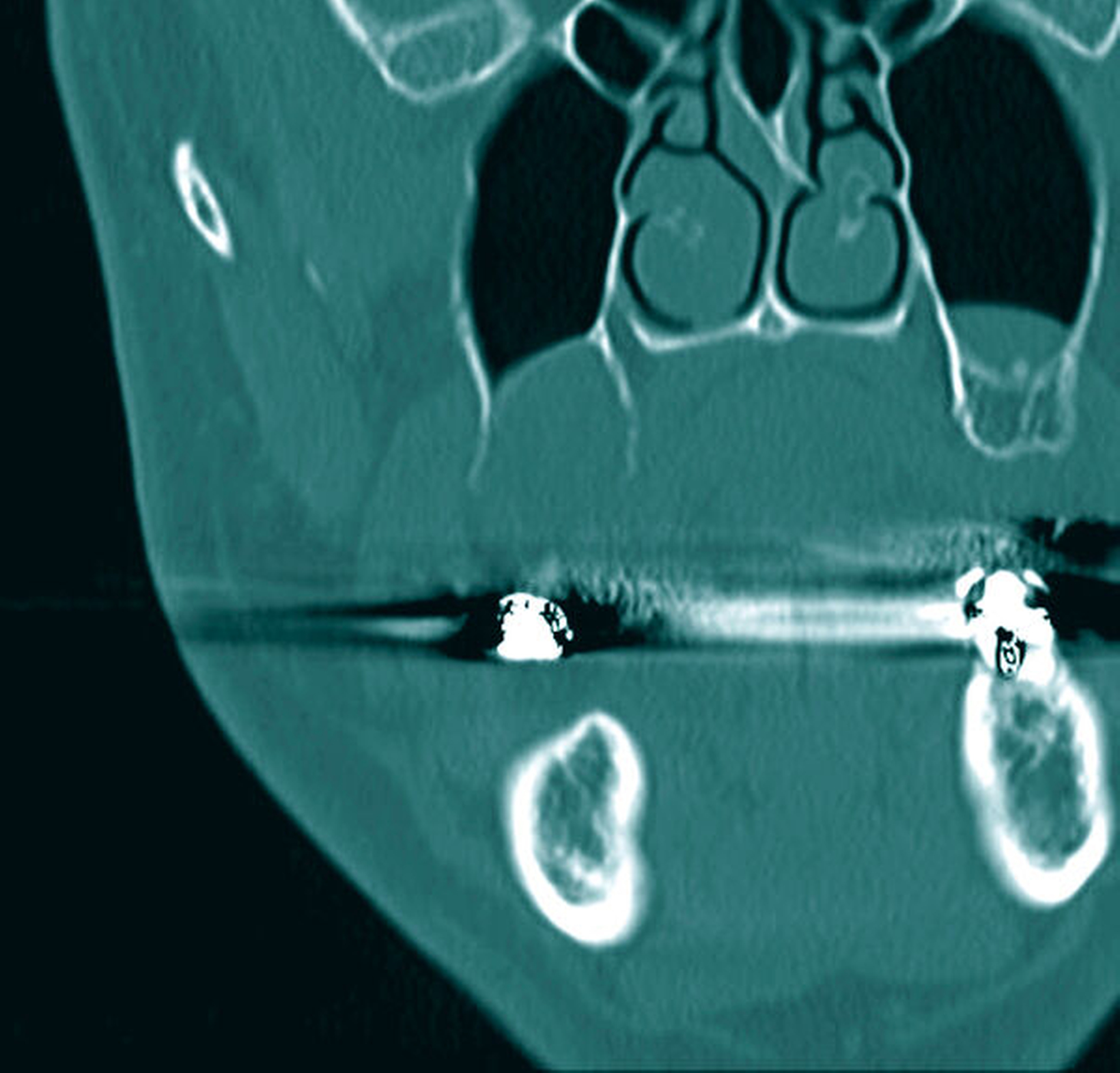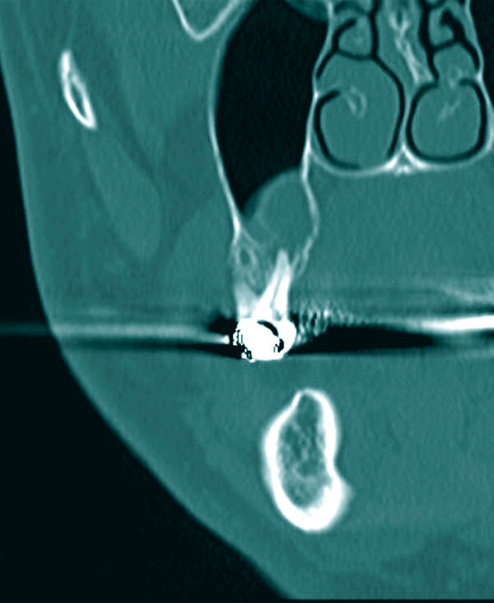 Das anschließend durchgeführte DVT wies an der besagten Stelle eine weichgewebsdichte, scharf begrenzte, ovale Struktur mit stellenhafter Unterbrechung der Kompakta auf, die bis in die Kieferhöhle ragte (Abbildungen 3 und 4).