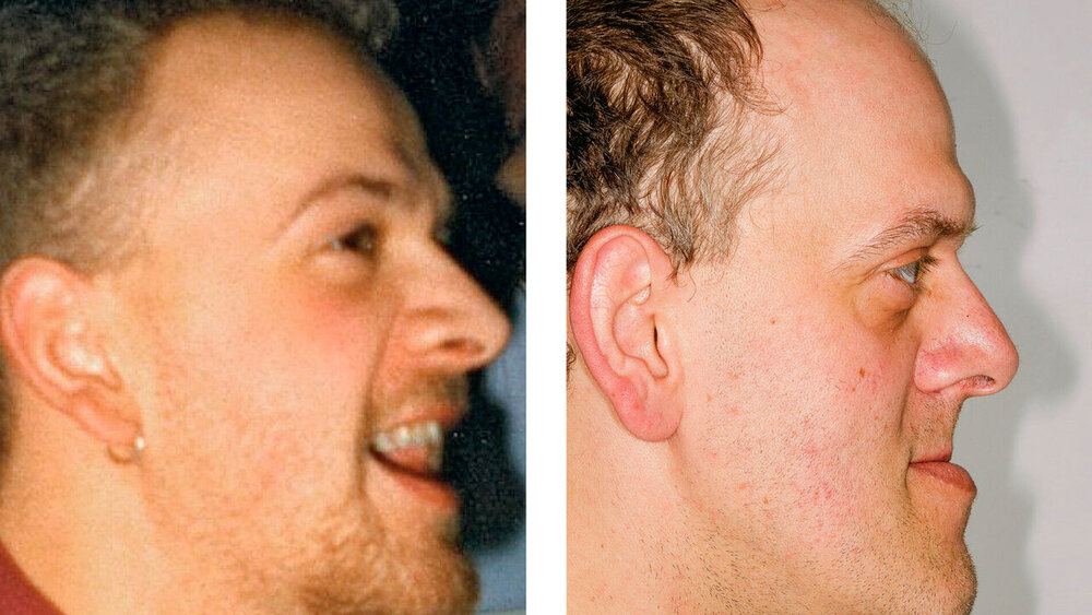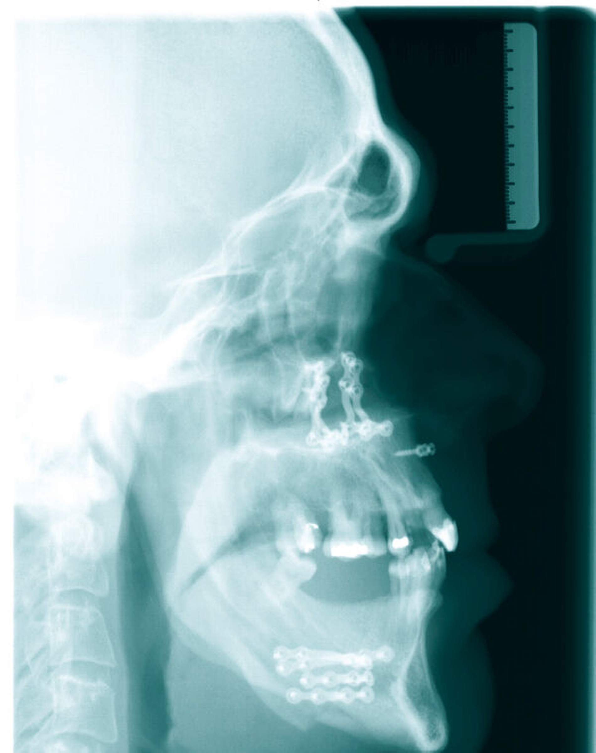 Aufgrund der postoperativen schwellungsbedingten Atemwegseinengung wurde der Patient in dieser Zeit intensivmedizinisch betreut und prolongiert nach fünf Tagen extubiert. Er wurde letztlich am zwölften postoperativen Tag mit sicher gefundener Zielokklusion und deutlich harmonisiertem Gesichtsprofil locker verschnürt über einen prothetischen Interims-Zahnersatz aus der stationären Behandlung entlassen.