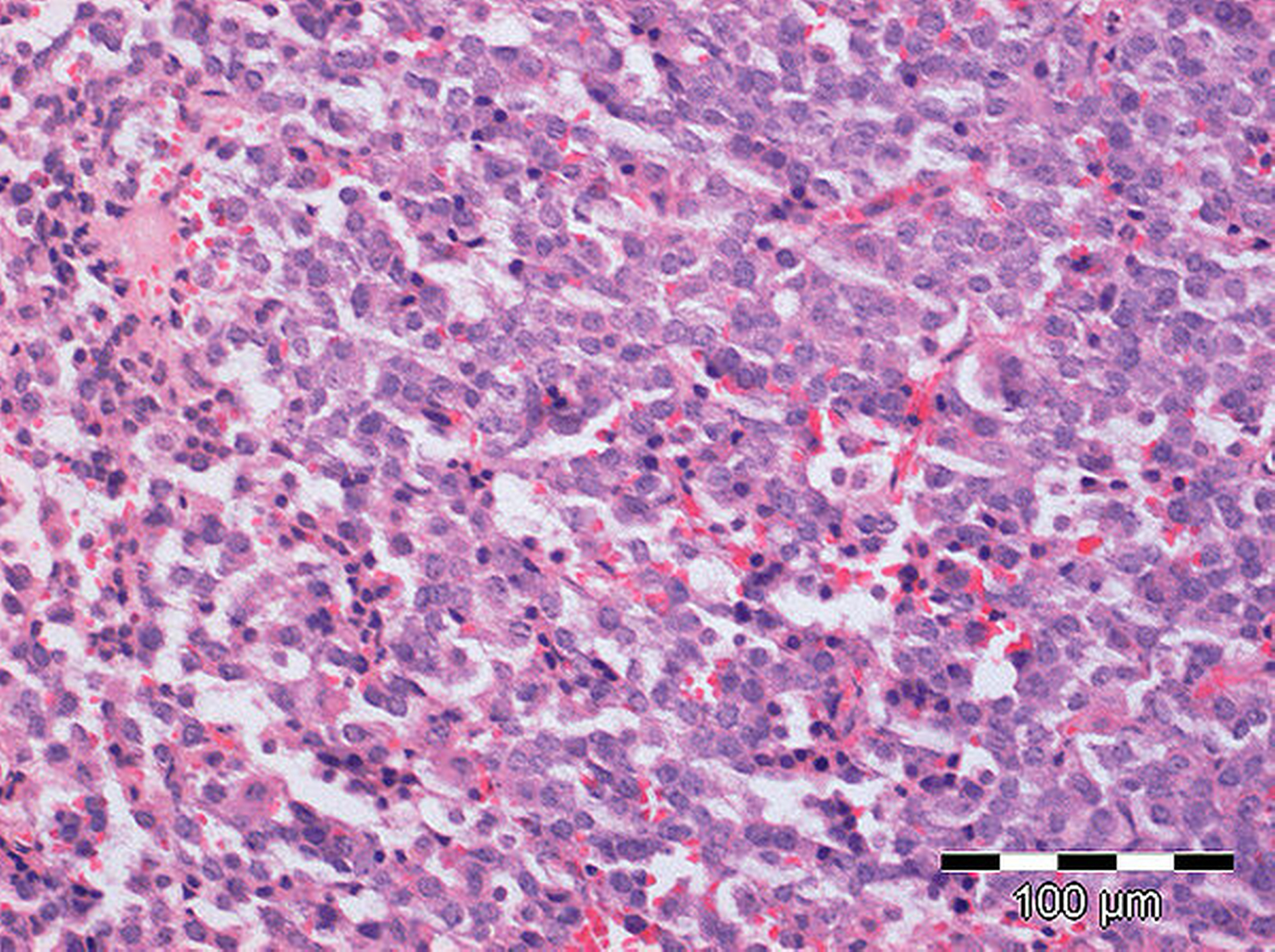 Aufgrund eines Liquorlecks wurde nach zwei Wochen eine Revisionsoperation erforderlich, wobei der Sellaboden mit Fascia lata vom rechten Oberschenkel abgedichtet wurde. Der histopathologische Untersuchungsbefund wies ein Hypophysenadenom mit Immunpositivität für STH sowie schwach für LH und Prolactin nach (Abbildung 4).