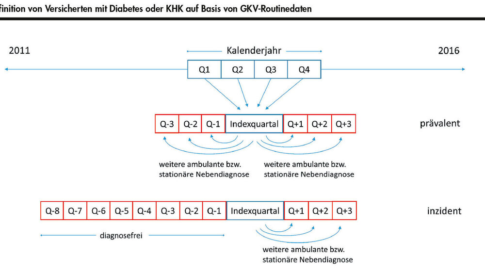 Die Versicherten mit Diabetes und KHK wurden anhand der ICD-10-Codes E10–E14 (Diabetes) beziehungsweise I20–I25 und Z95.1, Z95.5 (KHK) identifiziert. Als Versicherte mit jeweiliger chronischer Erkrankung wurden alle Personen eingeschlossen, für die