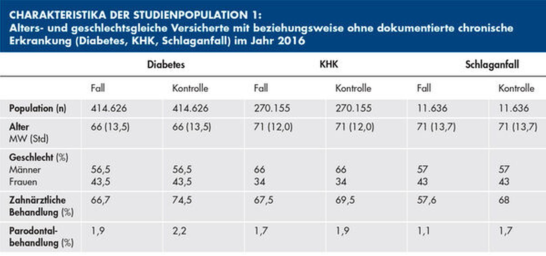 Im Jahr 2016 konnten 4.338.252 durchgängig beziehungsweise bis zum Tod durchgängig Versicherte in die Analyse eingeschlossen werden. Von diesen Versicherten leiden 9,6 Prozent an einer diagnostizierten Diabetes-Erkrankung (n = 414.626), 6,2 Prozent sind aufgrund einer KHK in Behandlung (n = 270.155). Die administrative Prävalenz eines Schlaganfalls liegt bei 0,3 Prozent (n = 11.636). Tabelle 1 zeigt für die Studienpopulation 1 die zahnärztlichen Inanspruchnahmeparameter.