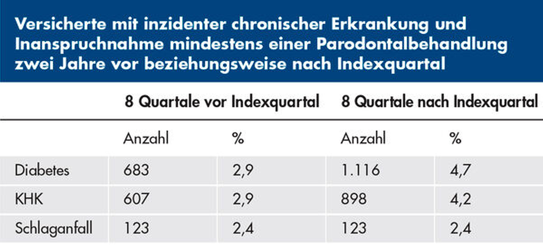 die Inanspruchnahme von Parodontalbehandlungen vor und nach dem Auftreten einer Neuerkrankung von Diabetes, KHK beziehungsweise Schlaganfall.