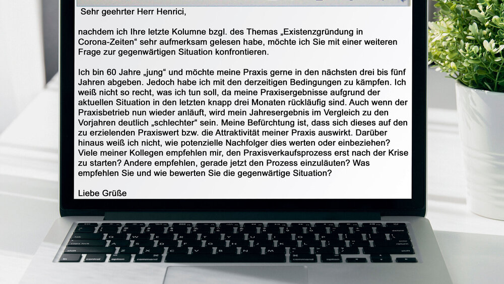 Tatsächlich werde ich aktuell vermehrt mit der Frage „Praxisabgabe zu Corona-Zeiten“ konfrontiert. Das wundert mich ein wenig, denn der Praxismarkt war schon vor Corona ein schwieriger und so viel hat sich gar nicht geändert. Viele Leserbriefe zu diesem Thema habe ich im Rahmen meiner Kolumne bereits beantwortet.