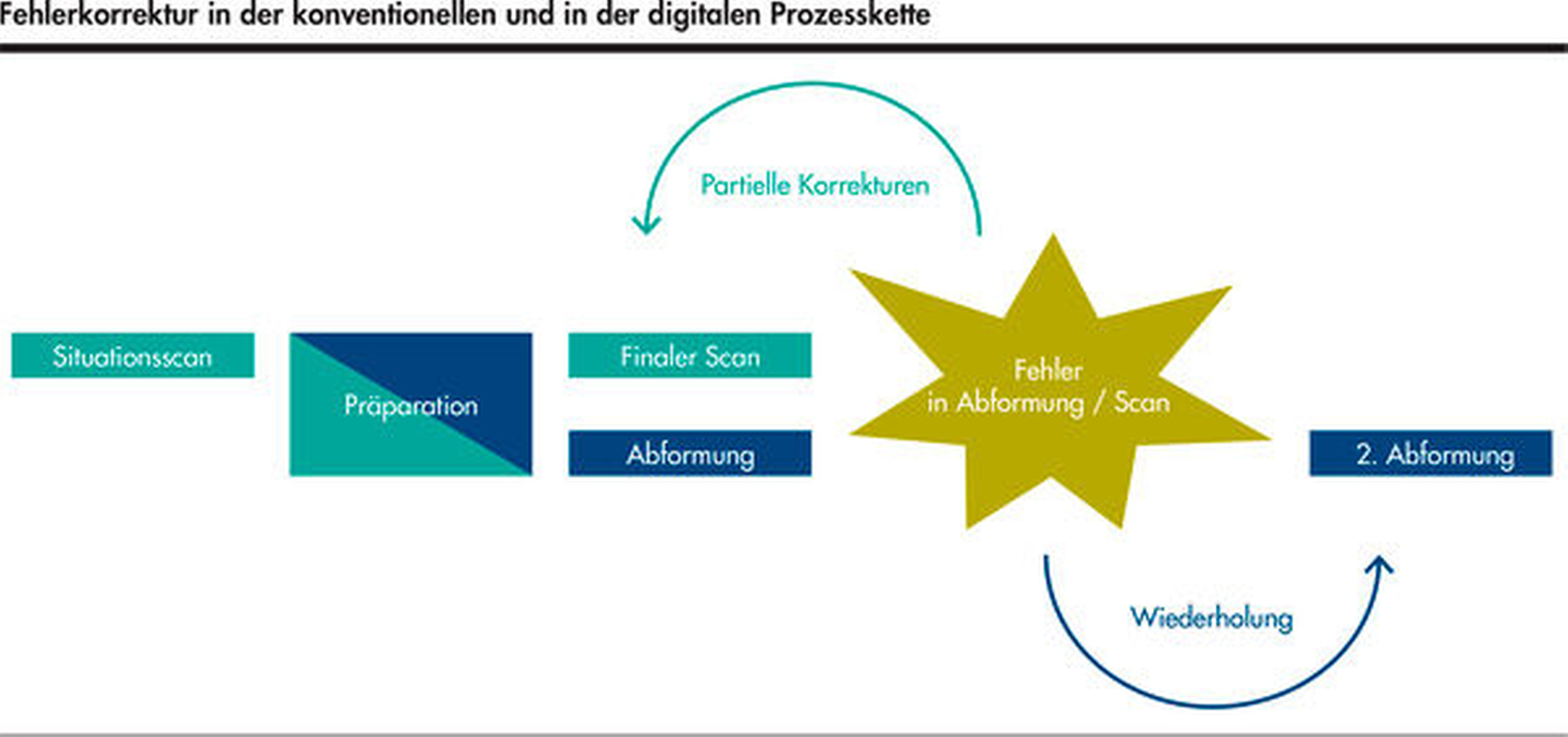 Für die Auswahl des Abformverfahrens (digital oder konventionell) ist aber nicht nur die Frage der prinzipiellen Reproduzierbarkeit der intraoralen Situation entscheidend, sondern ebenfalls die Art des sich anschließenden Prozessweges im zahntechnischen Labor. Jedwede Abformung – einerlei ob konventionell oder digital – dient niemals einem Selbstzweck, sondern stellt immer das Mittel zum Zweck dar, im zahntechnischen Labor anschließend Zahnersatz oder zahnärztlich-therapeutische Hilfsmittel (zum Beispiel individuelle Löffel, kieferorthopädische Geräte oder Schienen) herzustellen.