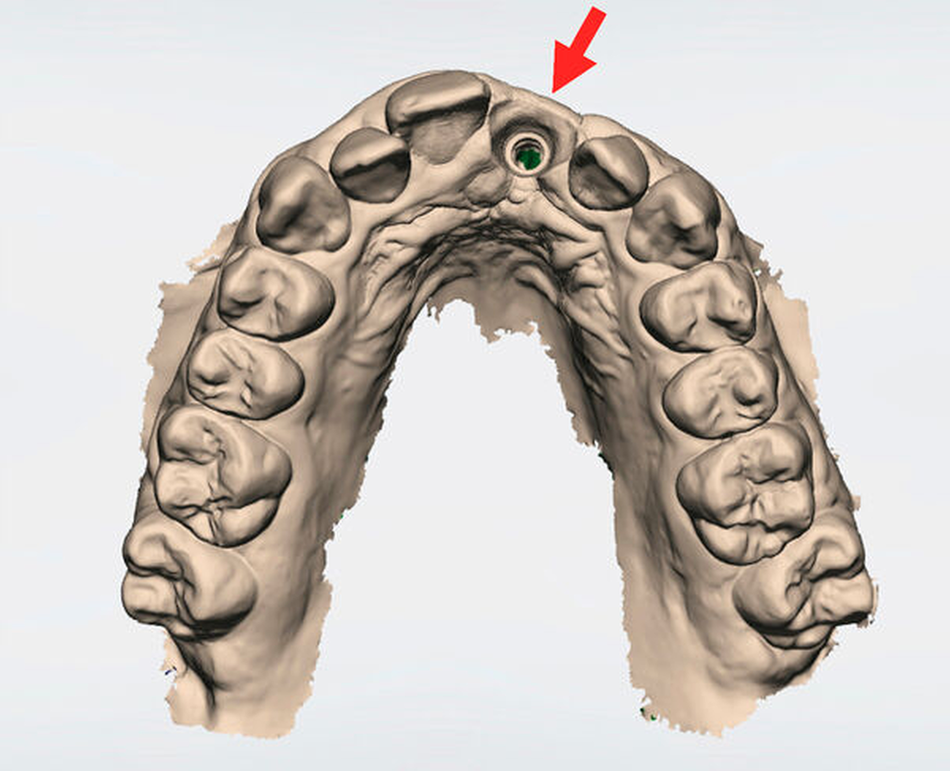 Abbildung 3 zeigt beispielhaft wie mit zunehmender Länge des Scanpfades beginnend beim Implantat in regio 14 über das Implantat in regio 16 bis hin zu den Implantaten 24 und 26 die dreidimensionale Fehlpositionierung der Implantate auf dem Modell kontinuierlich ansteigt. Vor diesem Hintergrund ist für die digitale Abformung im Zusammenhang mit Implantatversorgungen festzuhalten, dass ein intraoraler Scan vornehmlich zur Wiedergabe einzelner oder mehrerer Implantate im selben Quadranten geeignet ist. Gerade im Hinblick auf die Möglichkeit der intraoperativen Abformung mit sterilen Scanbodies (Abbildung 4) oder der vollständigen Darstellung des Emergenzprofils (Abbildung 5), das mit konventionellen Abformmethoden häufig schwierig ist, ist die digitale Implantatabformung durchaus vorteilhaft und empfehlenswert.