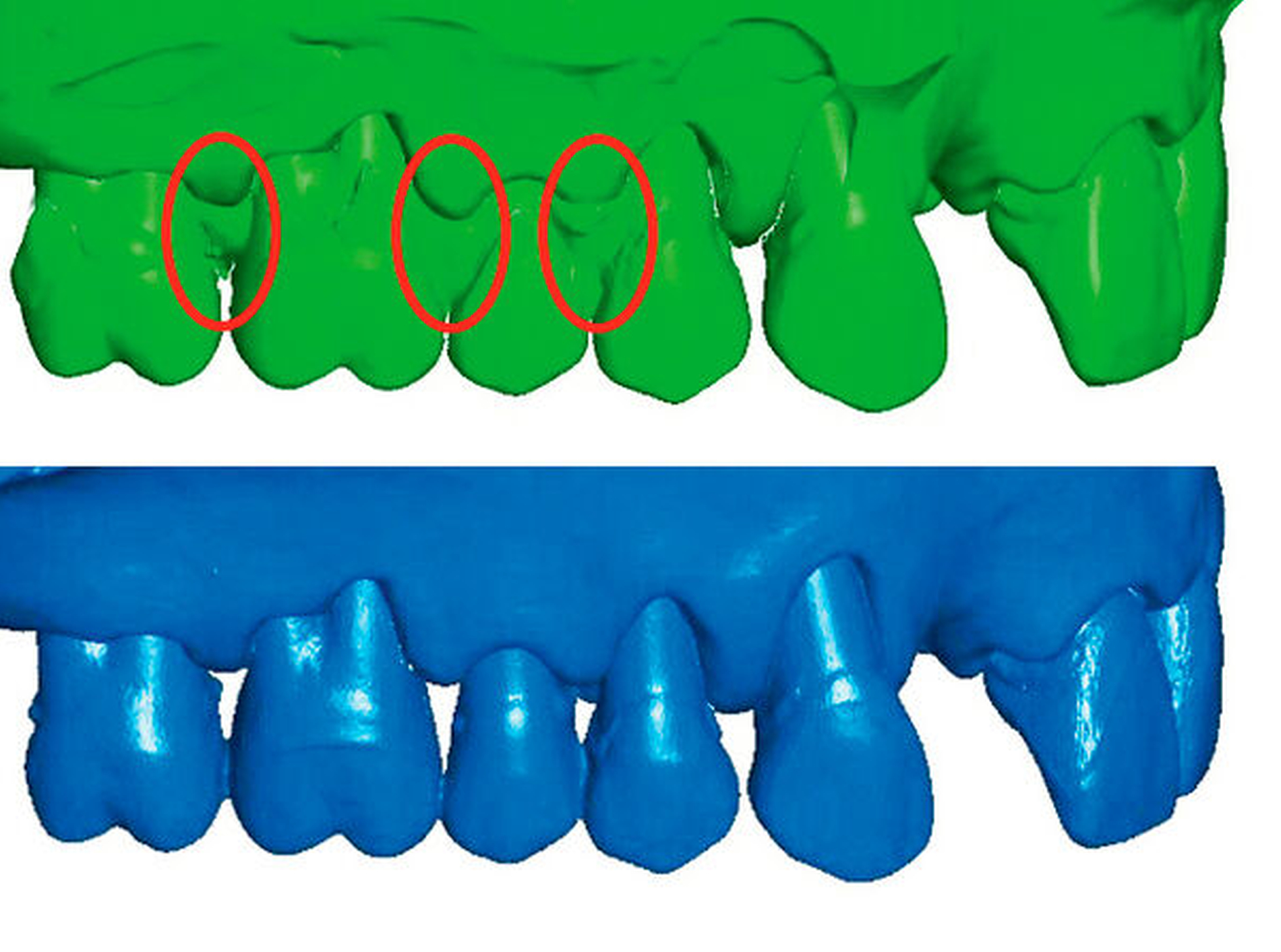 Aufgrund der Eigenbeweglichkeit natürlicher Zähne, die im Vergleich zu Implantaten um den Faktor 5 bis 10 größer ausfällt [Parfitt, 1960], ist die beim Matching erreichte Genauigkeit bei der Reproduktion eines ganzen Kiefers bei den meisten heute verfügbaren Systemen so hoch, dass sie für die Herstellung von herausnehmbarem Zahnersatz wie Einstückgussprothesen sowie von zahnärztlich-therapeutischen Hilfsmitteln wie Modellen, Bohrschablonen, Schienen oder kieferorthopädischen Apparaturen ausreicht. Insbesondere bei der Herstellung von kieferorthopädischen Alignern ist die korrekte Darstellung des Interdentalraums zwingend erforderlich, was gerade in der Erwachsenentherapie durch weite Interdentalräume und große Unterschnitte eine Herausforderung darstellt. Häufig lassen sich mit konventionellen Abformmethoden durch das Ausreißen des Abformmaterials Interdentalräume gar nicht oder nur teilweise darstellen. Hier zeigen Intraoralscanner signifikant bessere Ergebnisse (Abbildung 6) [Schlenz et al., 2019].