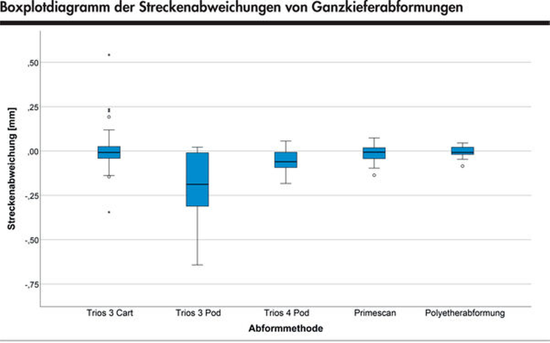 Dabei darf aber nicht übersehen werden, dass die mit konventionellen Verfahren erreichte Reproduktionsgenauigkeit des ganzen Kiefers nach wie vor von intraoralen Scannern nur in Ausnahmefällen annähernd erreicht wird. Zur Visualisierung sind in Abbildung 7 die in einer aktuellen klinischen Studie gemessenen Streckenabweichungen von Ganzkieferabformungen verschiedener Intraoralscanner und einer konventionellen Polyetherabformung dargestellt [Schmidt et al., 2020]. Mit zunehmender Weiterentwicklung der Software ist jedoch von einer stetigen Verbesserung der Scansysteme auszugehen [Ender et al., 2019; Haddadi et al., 2018].