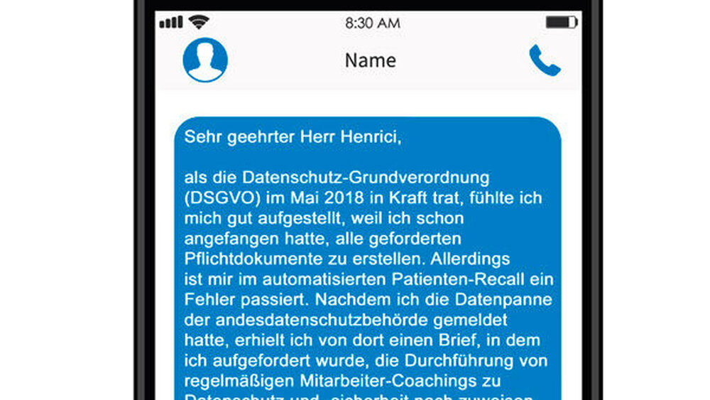 Daten und Team – dieses Thema wird aus meiner Sicht in der Zahnarztpraxis sträflich vernachlässigt. Fehlen entsprechende Mitarbeiter- und Teamcoachings, wird das vom Gesetzgeber sanktioniert. Seit dem Start der DSGVO ist immer wieder von einzelnen Sanktionen oder Beschwerden zu hören. Viele Zahnarztpraxen kämpfen immer noch mit der Umsetzung und sind deshalb der Gefahr ausgesetzt, auch mit einem Bußgeld belegt zu werden. Die verhängten Strafen können für ein mittelständisches Unternehmen schnell existenzbedrohend werden, den entstehenden Imageschaden möchte ich an dieser Stelle außen vor lassen.