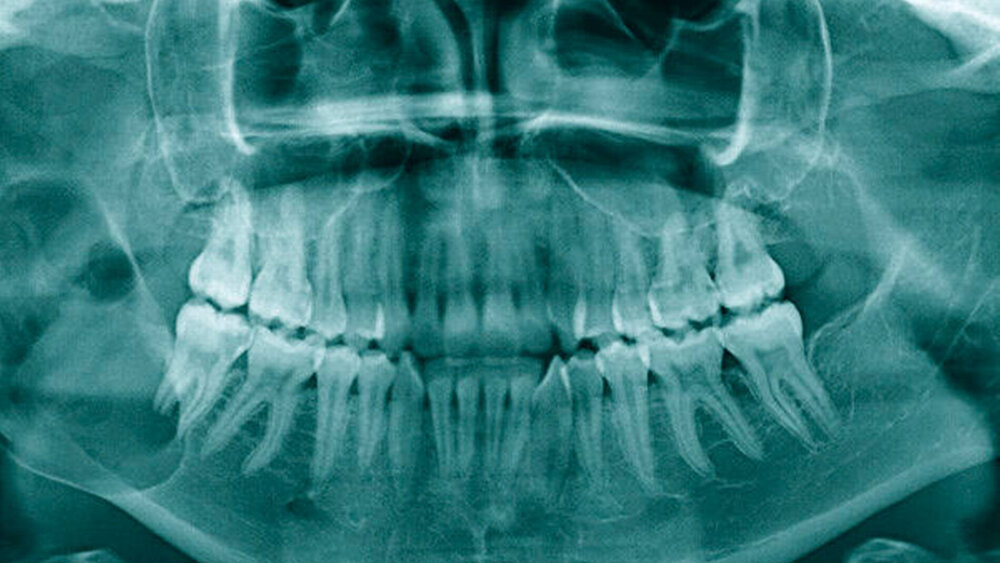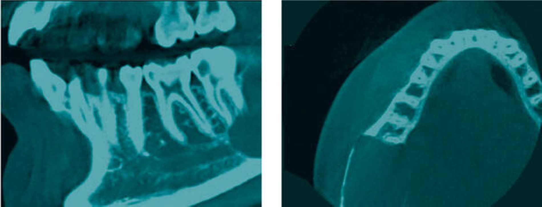Zur Beurteilung der Befundausdehnung und Planung der Therapie wird eine Digitale Volumentomografie (DVT) des Mittelgesichts inklusive Unterkiefer angefertigt (Abbildung). Hier zeigen sich die vestibuläre und linguale Compacta massiv atroph und crestal sowie lingual bereits perforiert. Die Lage des Nervus alveolaris inferior projiziert sich kaudal des Befunds und erscheint in seinem Verlauf nicht verdrängt.