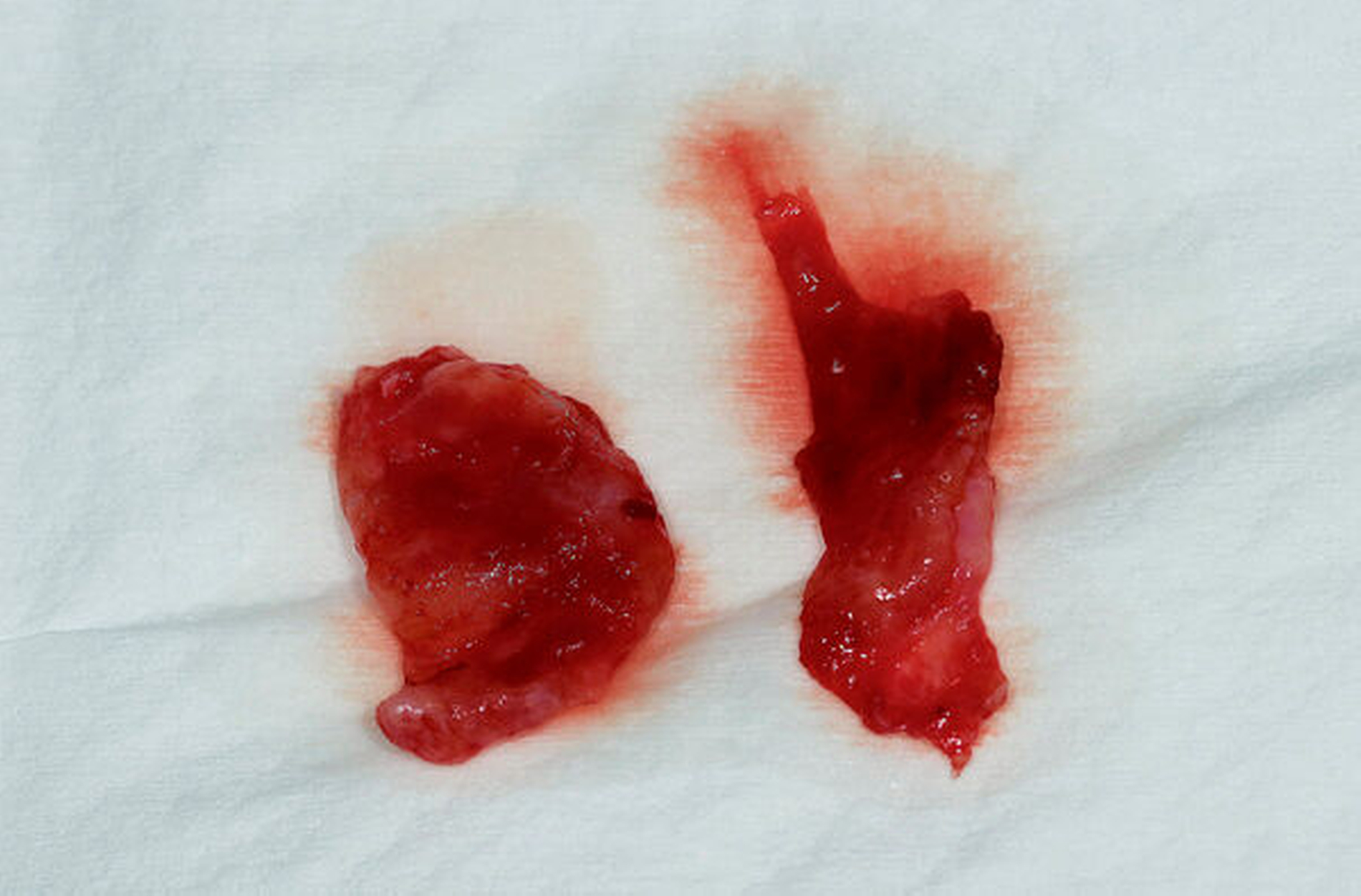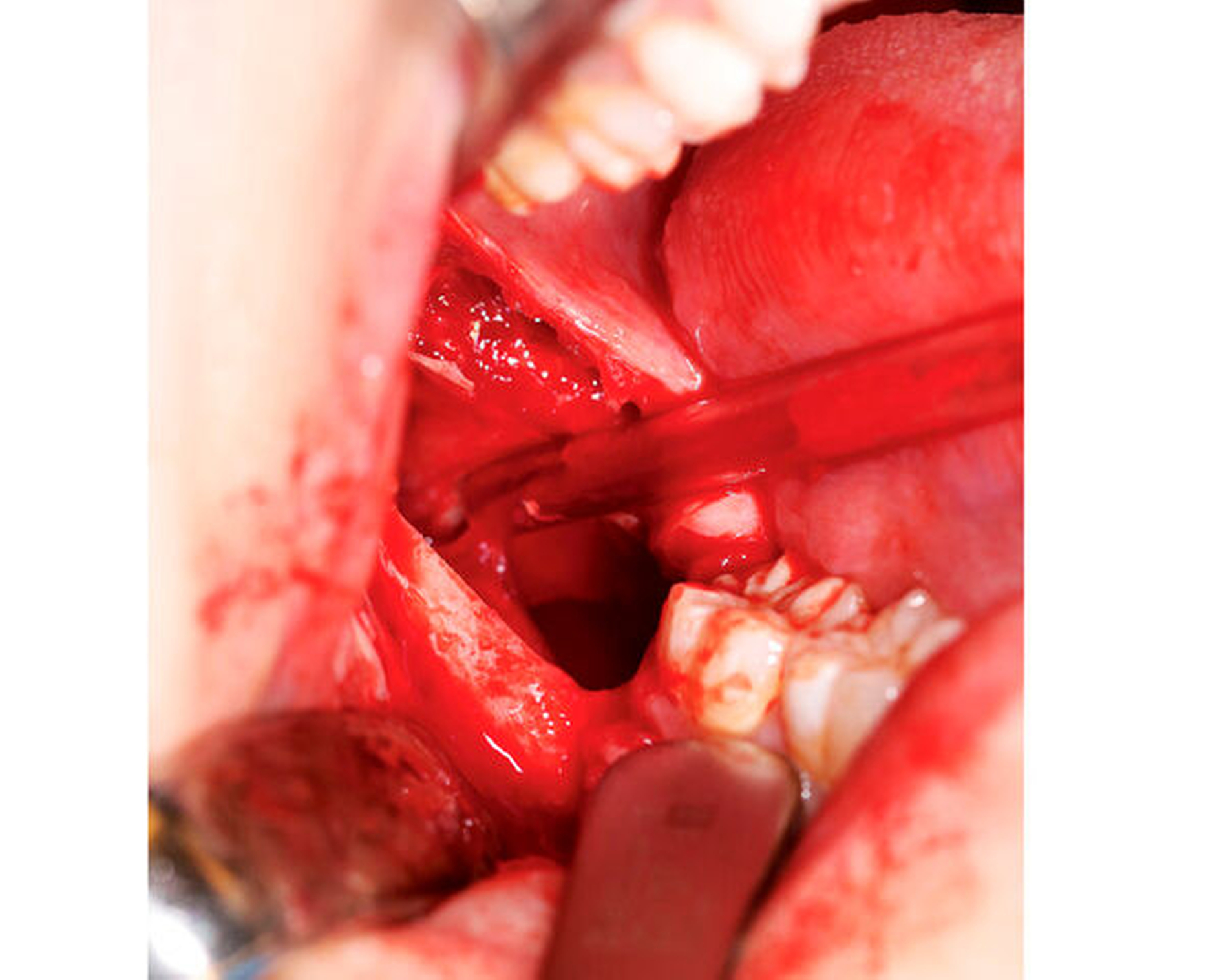 Aufgrund der Gefahr einer Spontanfraktur ebenso wie zur histopathologischen Befundsicherung wird die Indikation zur Zystektomie in Intubationsnarkose gestellt. Diese erfolgt durch Inzision crestal distal des Zahns 47 und im Bereich des aufsteigenden Unterkieferasts mit Bildung eines Mukoperiostlappens. Nach subperiostaler Präparation lässt sich die ausgedehnte Zyste problemlos darstellen (Abbildung 3). Korrespondierend zum vorliegenden radiologischen Befund erreicht die Raumforderung die linguale Knochenkante. Unter Schonung des N. alveolaris inferior werden die Enukleation der Zyste in zwei Teilen und die Entfernung der crestal beteiligten Knochenanteile vorgenommen (Abbildung 4). Nach ausgiebiger Spülung kann der entstandene Defekt nach Einlage von Kollagenschwämmen mittels des vorgelegten Mukoperiostlappens plastisch gedeckt werden.