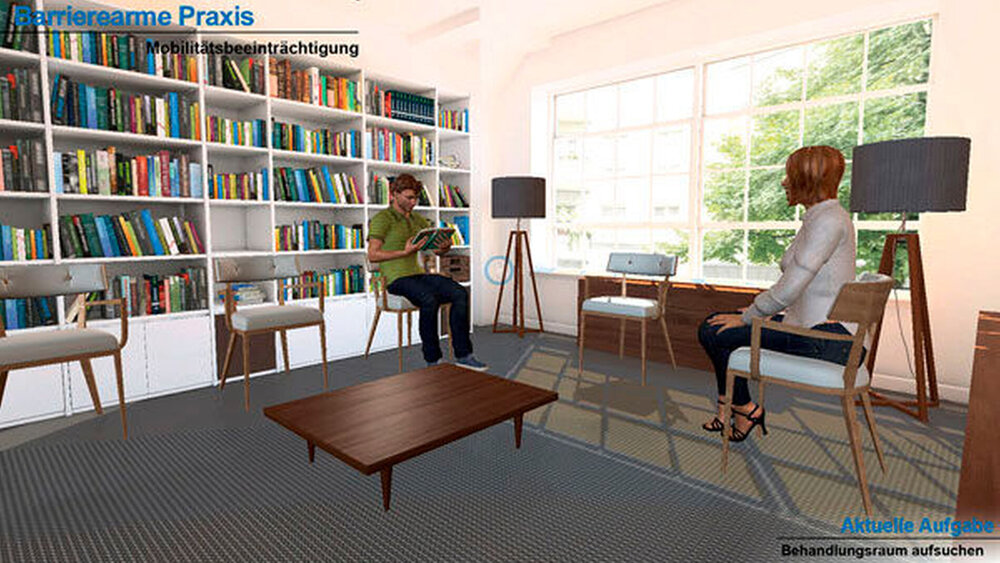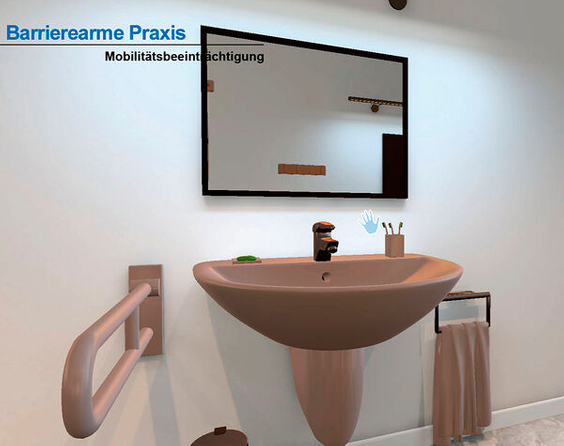 Aufgezeigt werden mögliche Barrieren für Menschen mit einer Hör- oder einer Sehbeeinträchtigung und für Patienten im Rollstuhl – am Eingang, am Empfang, im Warte-, im Behandlungszimmer und im Sanitärbereich (Abbildung). Für jede Barriere werden praktikable Vorschläge für deren Abbau unterbreitet. Der Schwerpunkt des Rundgangs liegt auf baulichen Aspekten und der Kommunikation in der Praxis. Zahnärztinnen und Zahnärzte können mit der aufwendigen digitalen Anwendung Barrieren aus der Perspektive der genannten Patienten erfahren. Praxisinhaber sollen nach dem Willen der KZBV so motiviert und angeleitet werden, ihre Praxis so barrierearm wie möglich auszugestalten.